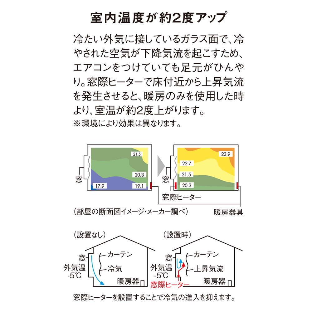 そこで、窓際の床付近から暖かい上昇気流を発生させて、冷気をシャットアウト。すると暖房のみを使用したときに比べ、なんと室内温度がおよそ2度もアップ!(※)
