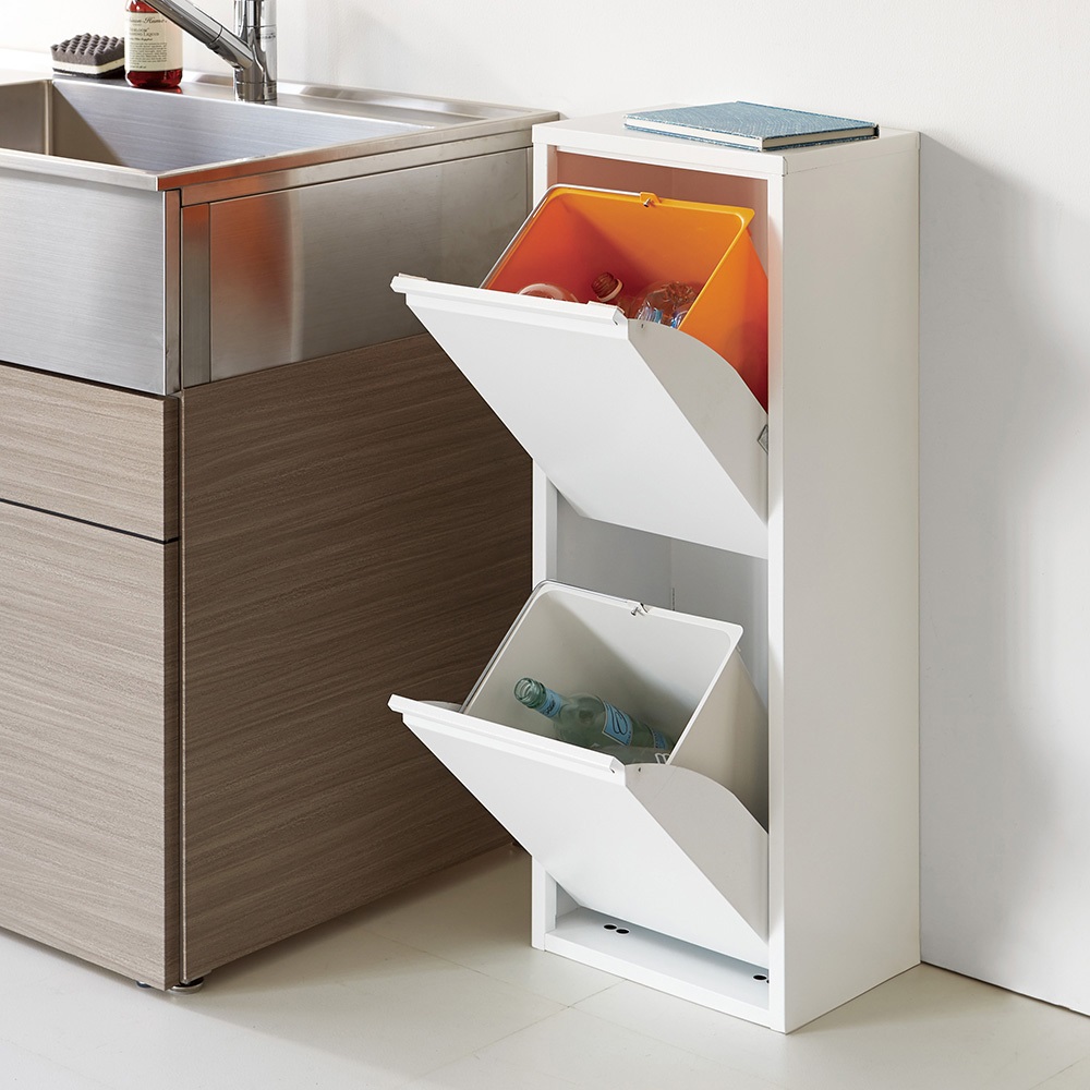■シンプルモダンなシルエットと、イタリアらしい色遣いと見た目が魅力の分別ごみ箱。■スマートな佇まいでありながら、おしゃれなデザインでキッチンのランクを格上げするフラップ扉(フタ)付きゴミ箱です。