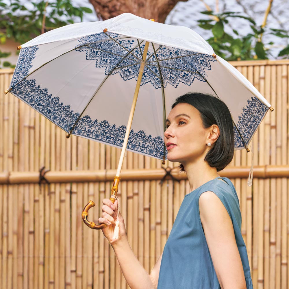 白色ベースにレース模様を施した長傘です。上品な印象ながら、普段使いにも馴染むシンプルなデザインで、大人の女性の装いを引き立てます。高いUVカット率と遮熱効果でしっかり対策