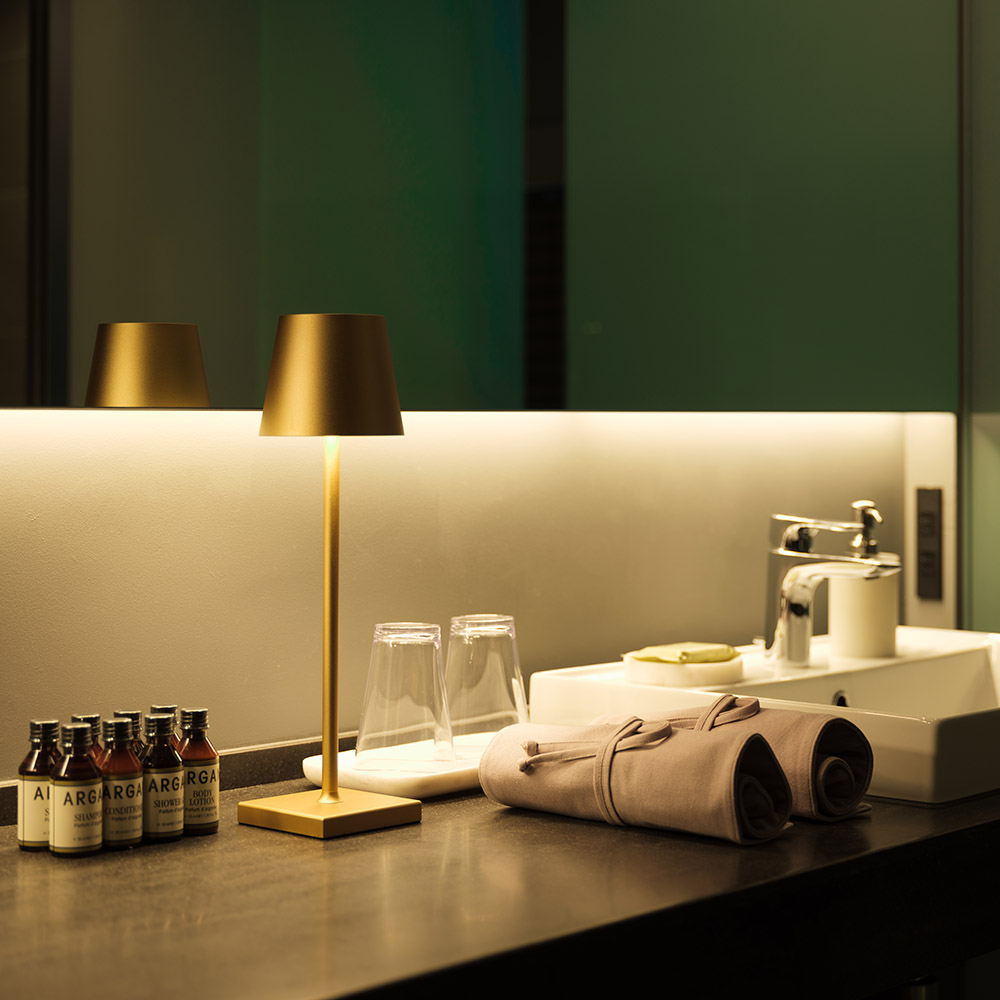 • 持ち運びやすいコードレスで、家の中の明かりがほしいシーンですぐに使用できるランプ。上質な雰囲気ながら、調光はタッチで手軽。1つテーブルに置けば、空間を引き立たせるアクセントに。