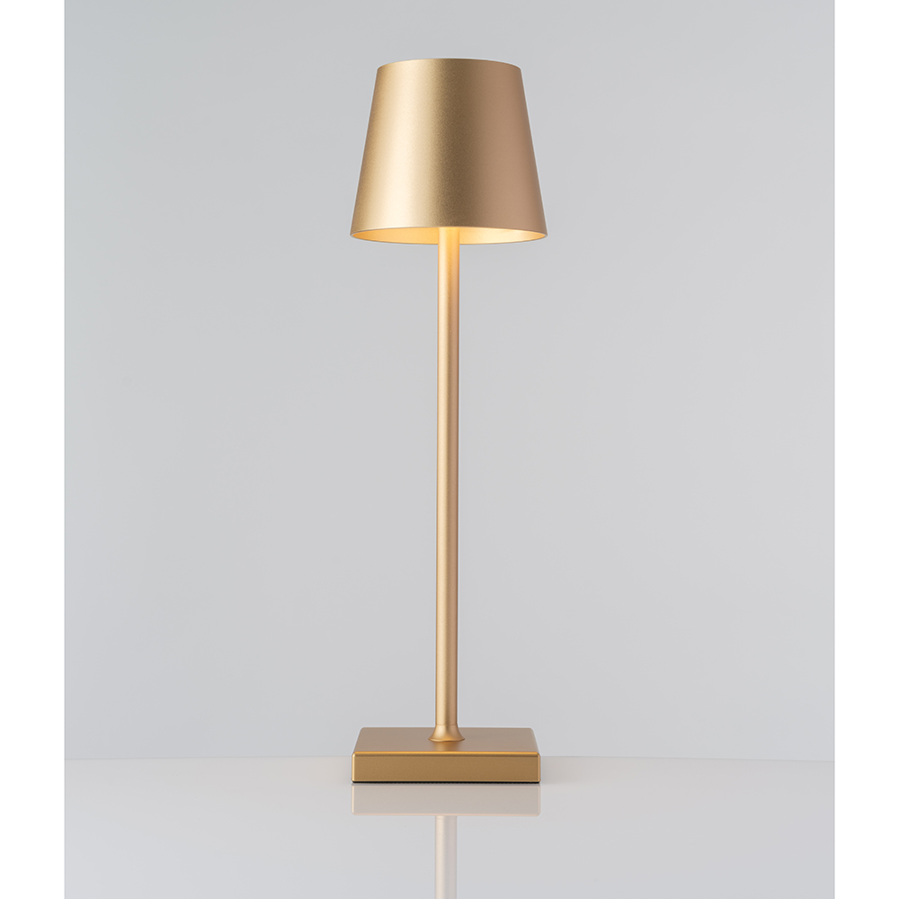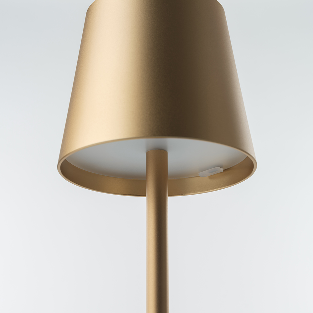 • コードレスで様々なシーンに持ち運べるテーブルランプ。カウンターからダイニングテーブルまで自由に照明をコーディネート。(左)ゴールド(中央)ホワイト(右)ブラウン ゴールドからブラウンにかけて調光を下げています。