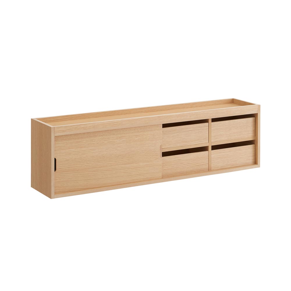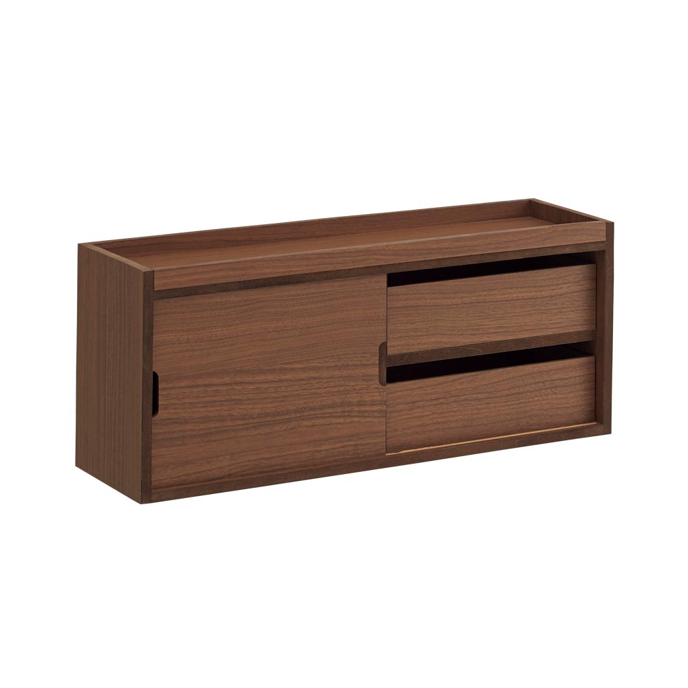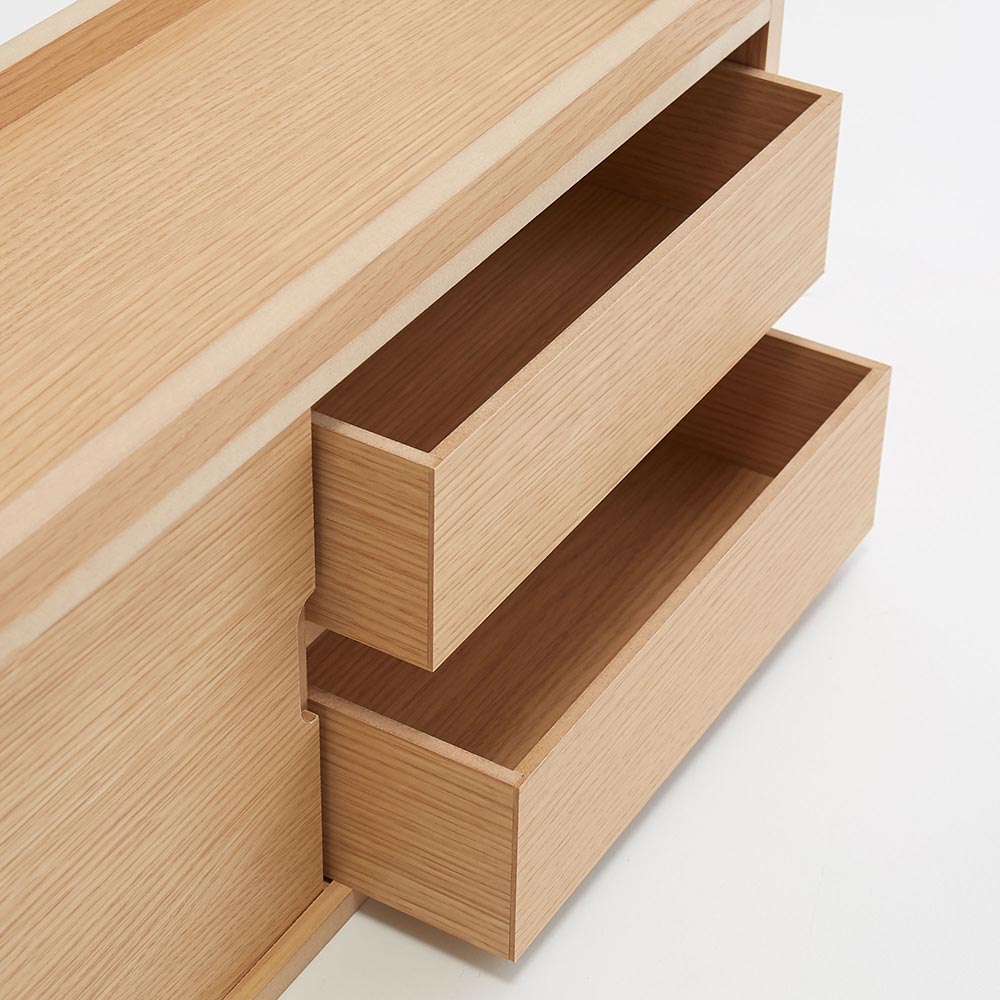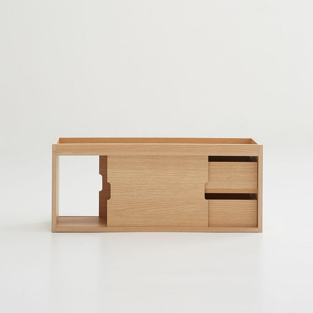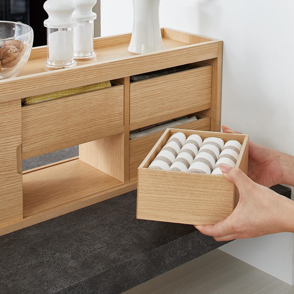 向かって半分が小引き出し、向かって半分が棚収納と収納したいものに応じて使い分けが可能です。