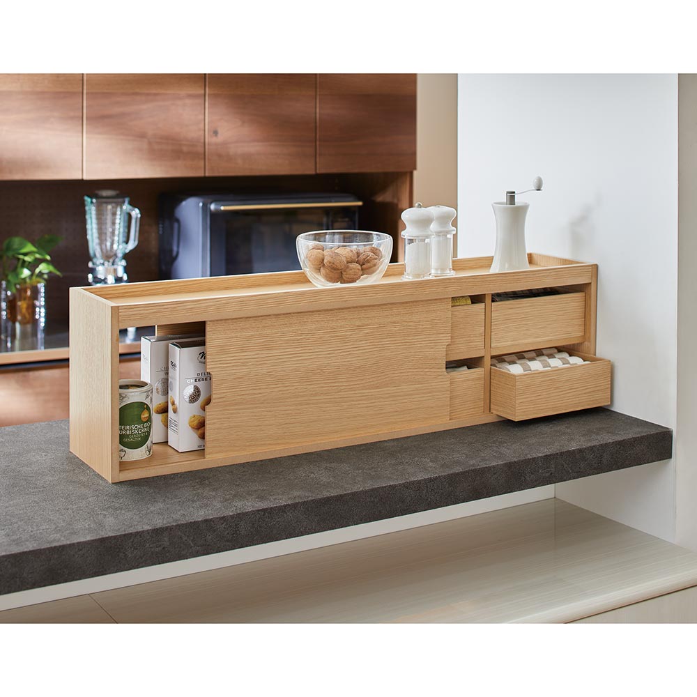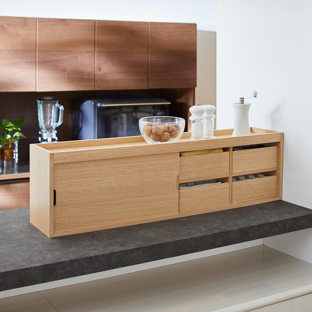 ■キッチンカウンターの返し天板の上に置くと、何かと重宝するカウンター上収納庫。■昨今増えてきたあまりスペースのない返し天板上にもちゃんと収まる薄型の収納庫です。