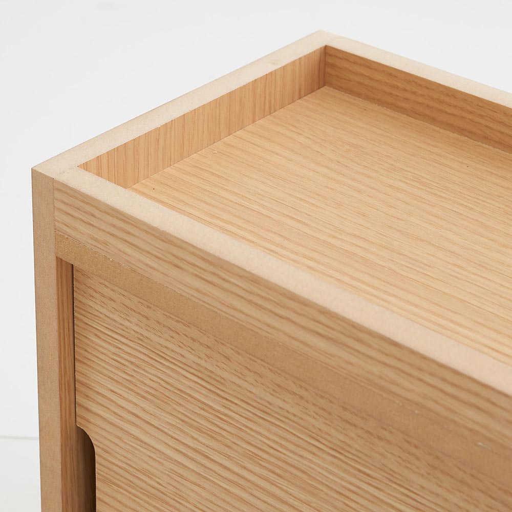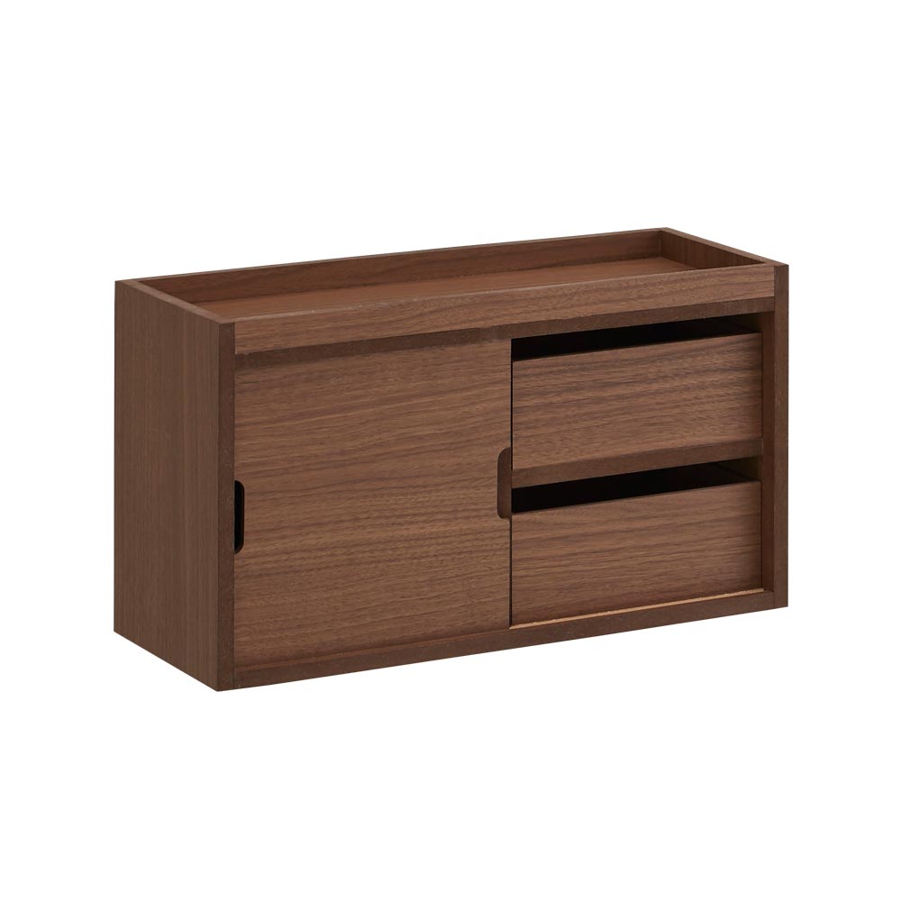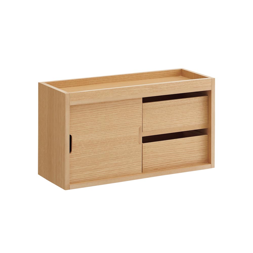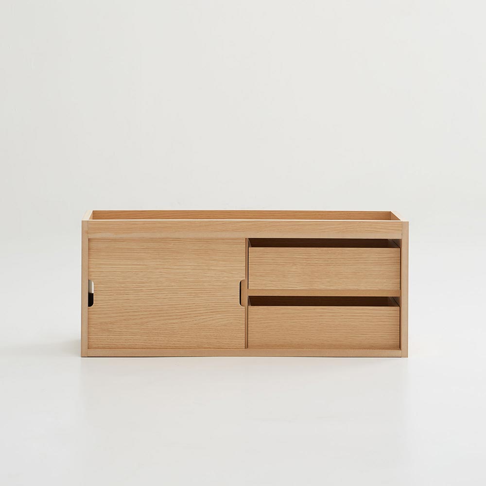 向かって半分が小引き出し、向かって半分が棚収納と収納したいものに応じて使い分けが可能です。