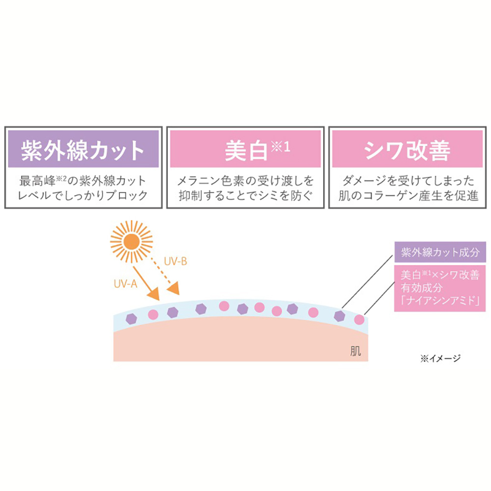国内最高基準値※3で紫外線を強力にカットしながら、美白※1とシワ改善効果も備えた日焼け止め美容液。ハリ不足や乾燥が気になる肌にみずみずしく広がり、化粧下地としても使えます。さらに耐水面でも最高評価(UV耐水性★★)を取得しているので、レジャーなどでも大活躍。【美容液成分を惜しみなく配合】