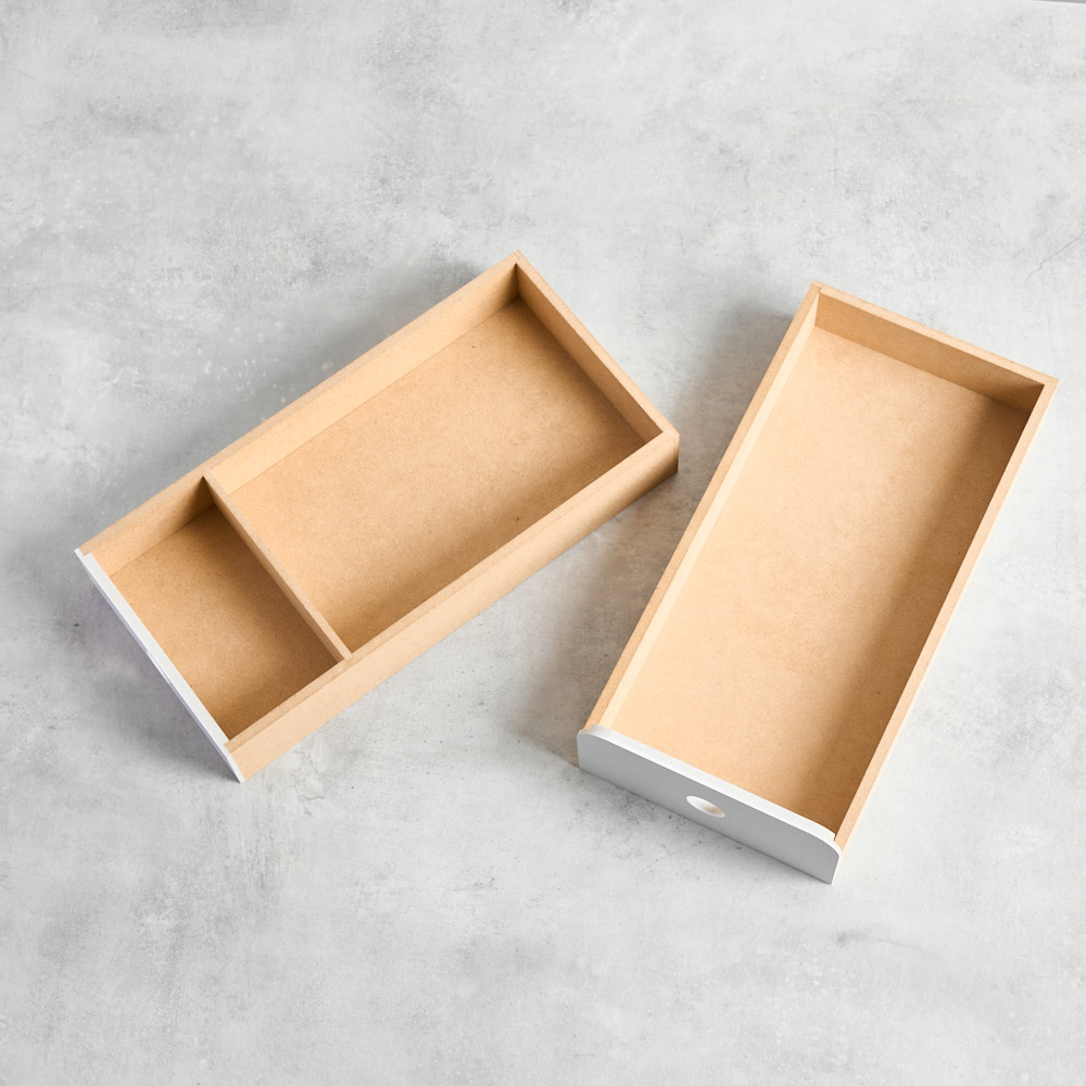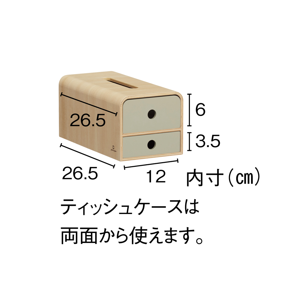 ■サイズ:幅14.5cm奥行28cm高さ13cm、引き出し内寸…上段(ティッシュ収納部)幅12cm奥行26.5cm高さ6cm、下段幅12cm奥行26cm高さ3.5cm(仕切り板付)