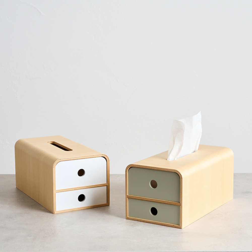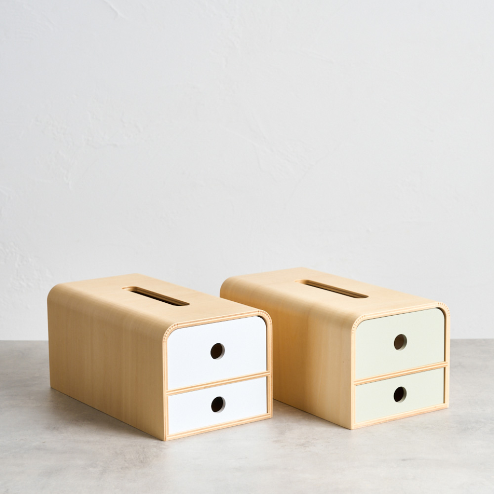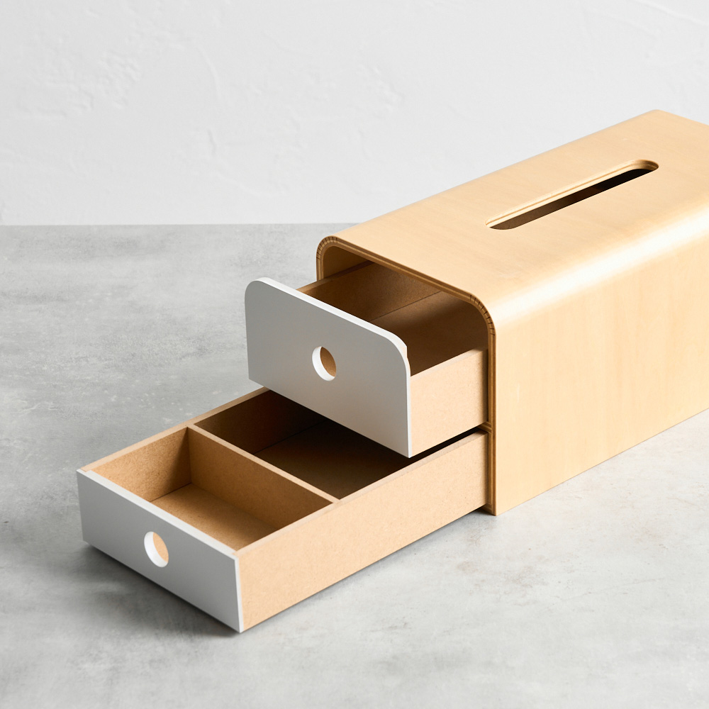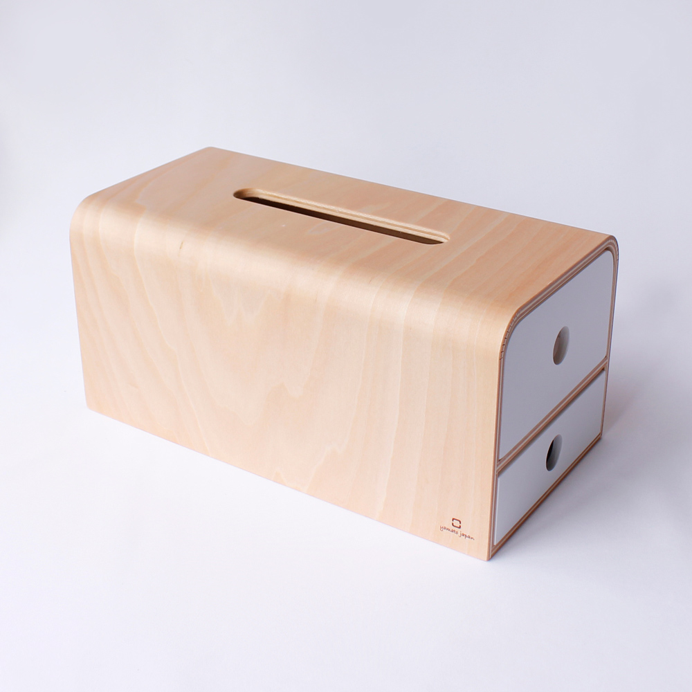 両面から使える仕様でしたが、引き出しが止まる背面付きにリニューアル。上下段どちらも引き出しを閉じやすく。曲木部分と同じシナを使用しています。■曲木の美しいティッシュボックス