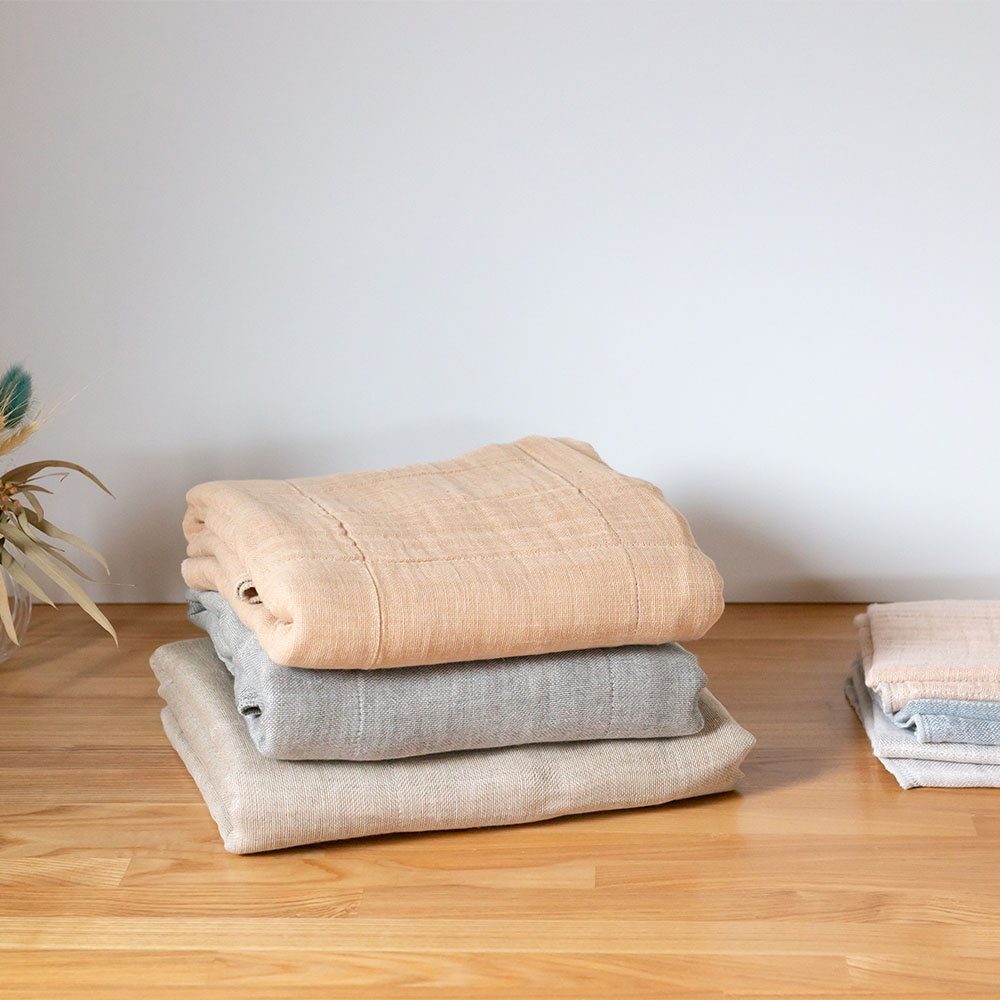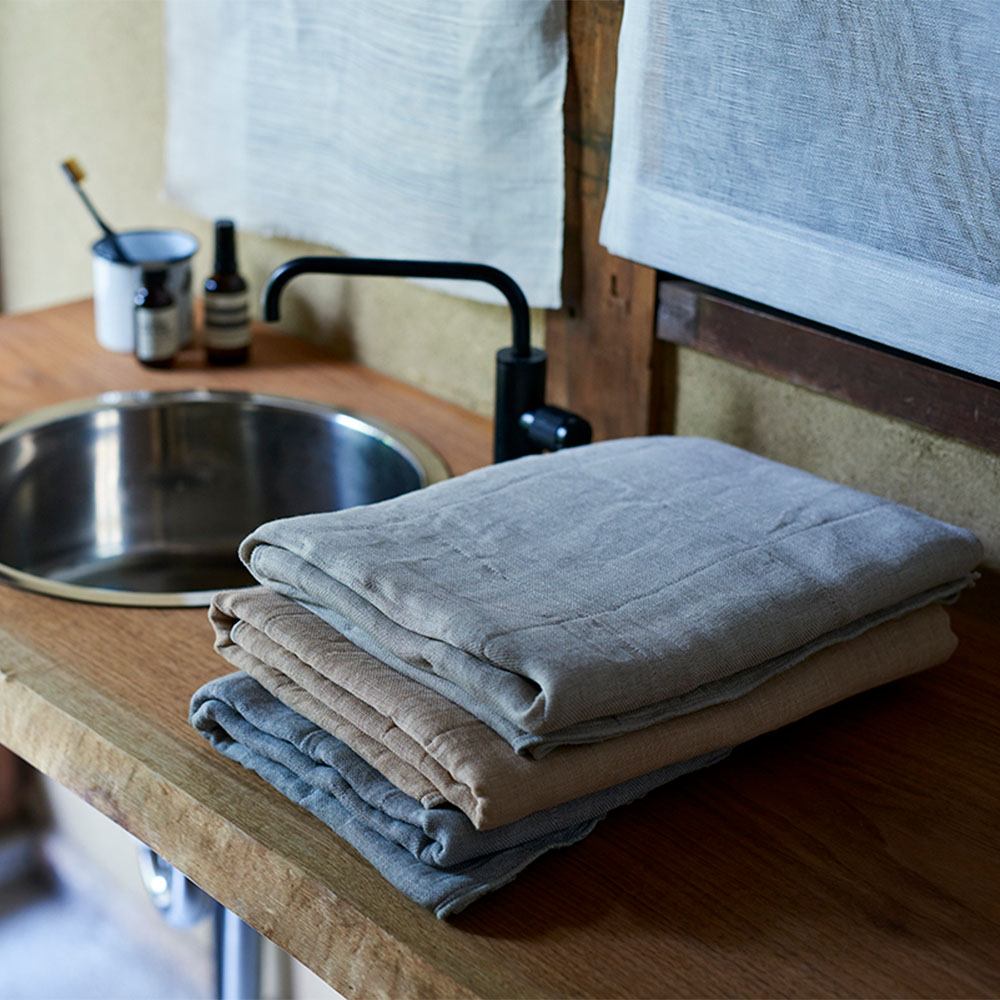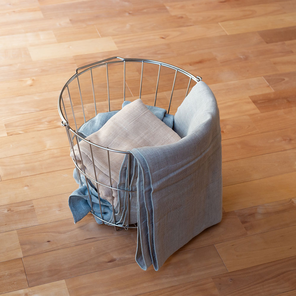 蚊帳織りは、糸と糸の間に程よい隙間を持たせた織り方で、空気を含みやすく、乾きやすいのが最大のメリットです。洗うほどに柔らかさが増し、ご家庭の洗濯機で簡単にお手入れができます。薄手なのに丈夫で、日常的な使用に適しています。1 丈夫で長持ち