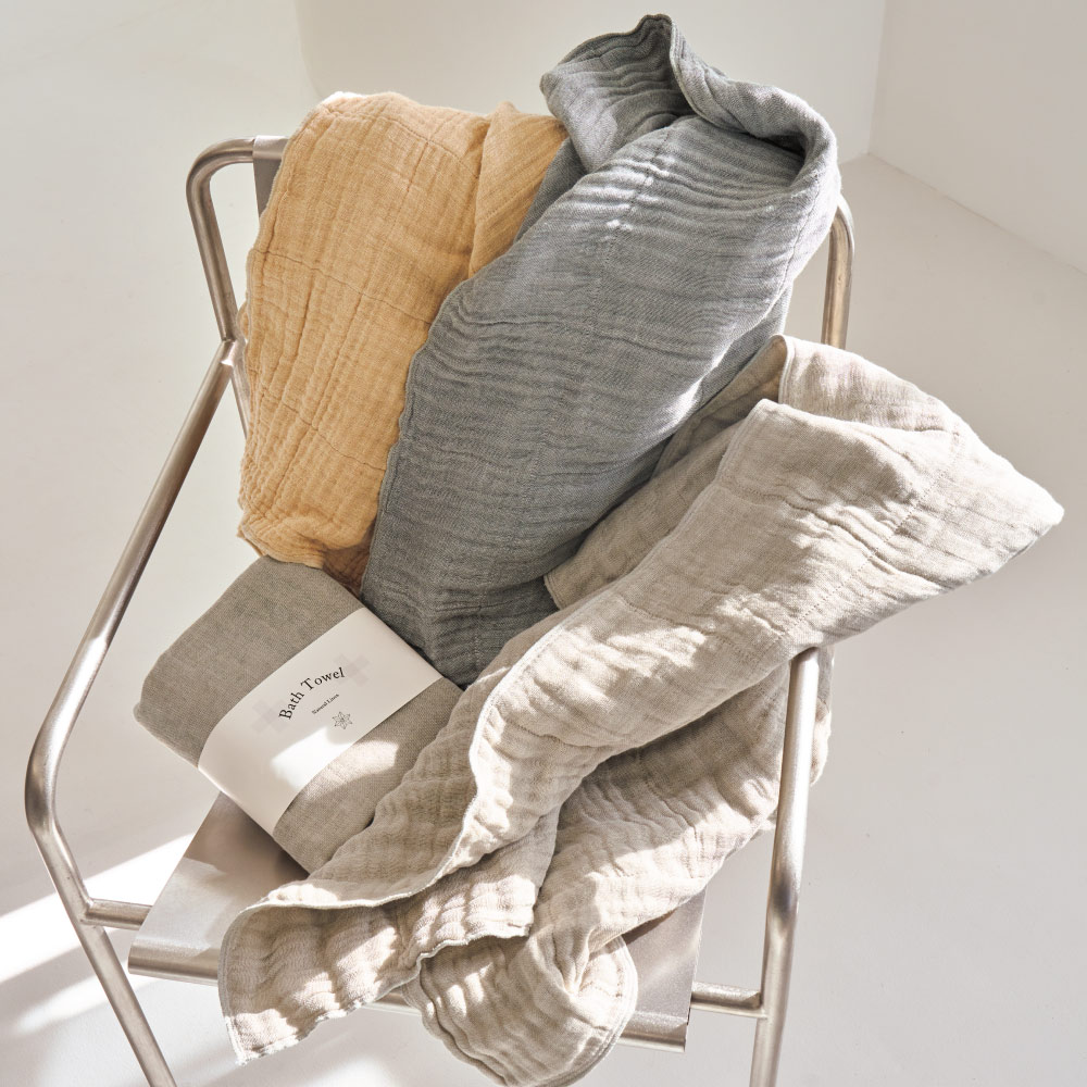 大判サイズで体をやさしく包み込み、お風呂上りに心地よく使えます。また、シンプルなデザインなのでインテリアにもなじみやすく、場所を選ばずお使いいただけます。美しく落ち着く3色