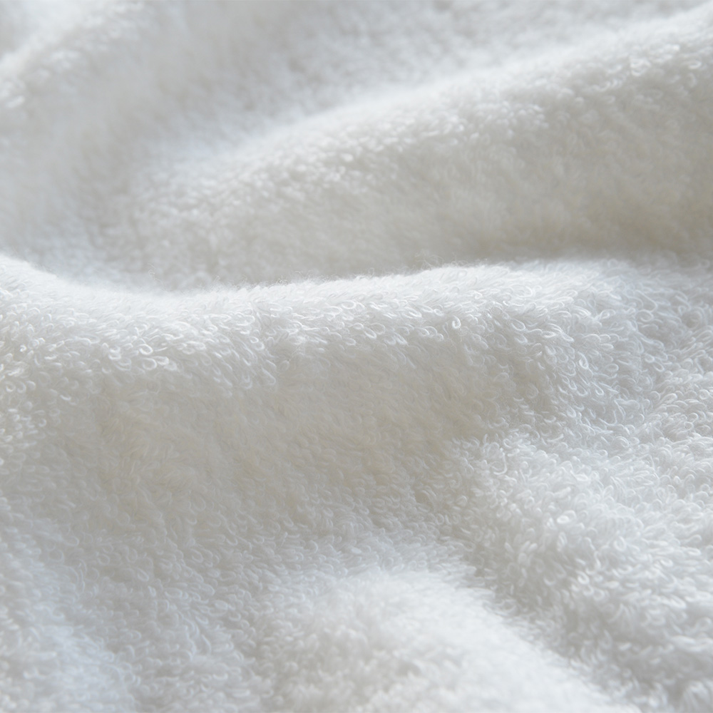 糸になる前の状態で2本の粗い糸を撚り合わせることで、表面がなめらかで光沢のある仕上がりに。毛羽も抑えられているので清潔感が続き、美しい見た目が長く楽しめます。ふっくらとした柔らかさと高い吸水力