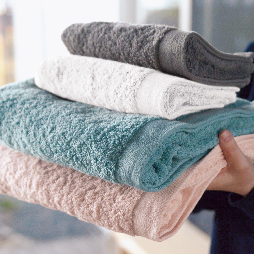 特殊な撚り加工で空気をたっぷり含んだ糸に仕上げているため、ふっくらとした柔らかな質感と高い吸水性を両立。朝の洗顔やお風呂上がりなど、毎日のさまざまなシーンで活躍します。毎日を心地よくする使い心地