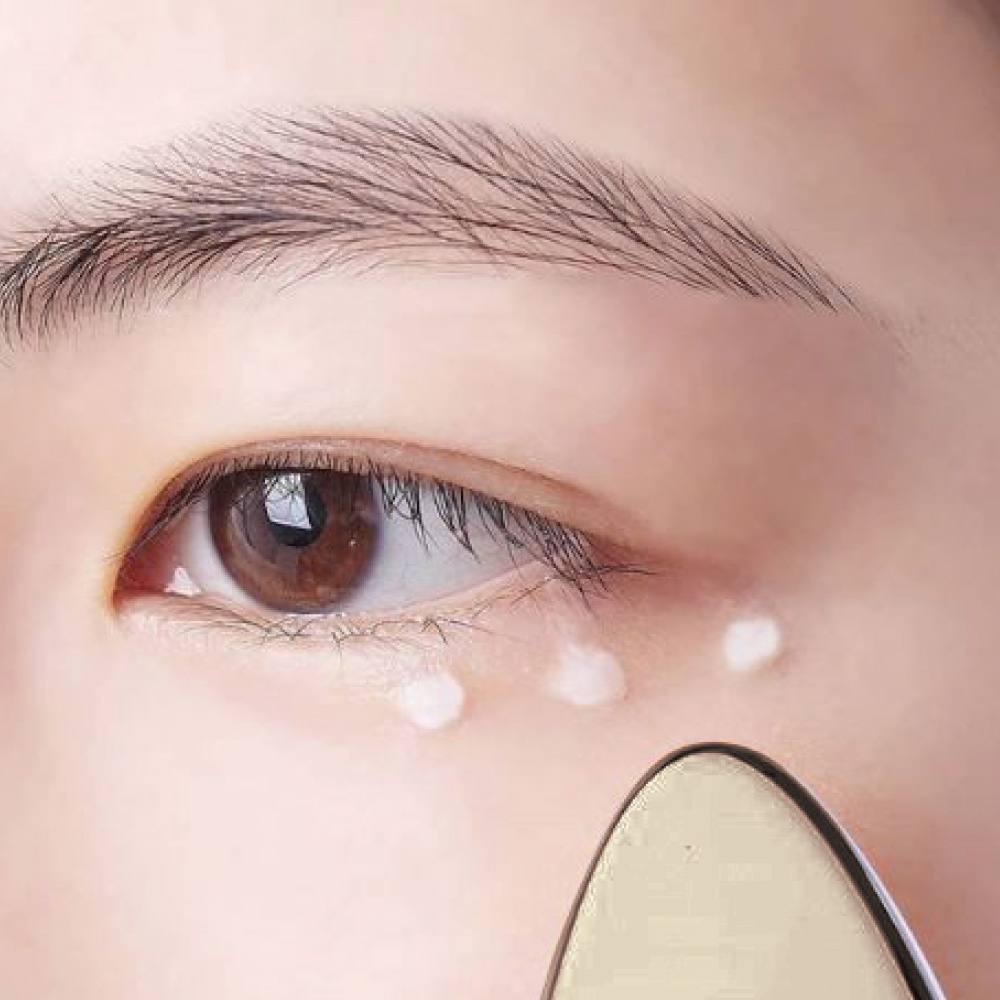 3. 均一に塗ってから、付属の美顔器を目の周りにあてて滑らせ、優しくなじませます。
