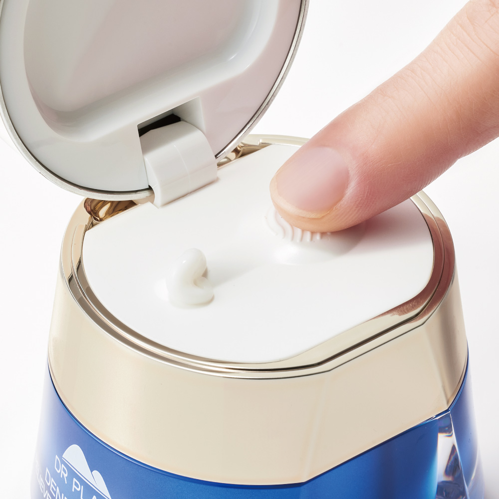 中身が空気に触れないプッシュ式エアレスパッケージ。ボタンをゆっくり押すとクリームが出てくる仕様。成分の劣化を防ぎながら衛生面にも配慮。