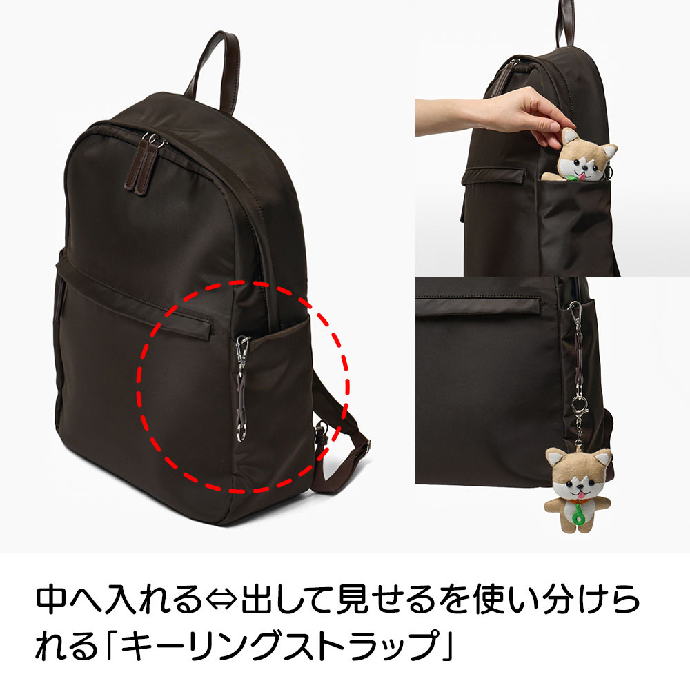 ■外側サイドポケット内側にキーリングストラップ×1(取り外し可能)、キーホルダー取り付け用Dカン×1