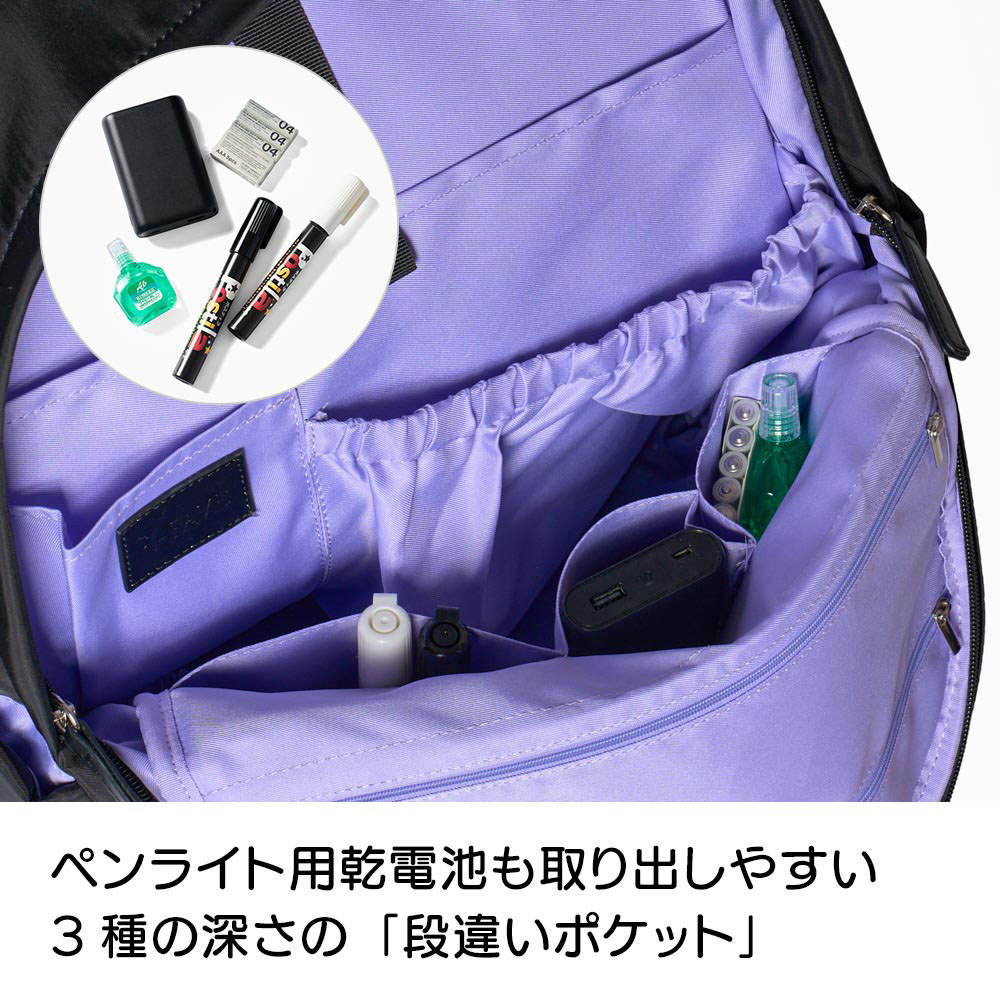 サイズの違うさまざまなものを取り出しやすく収納する、段違いポケット