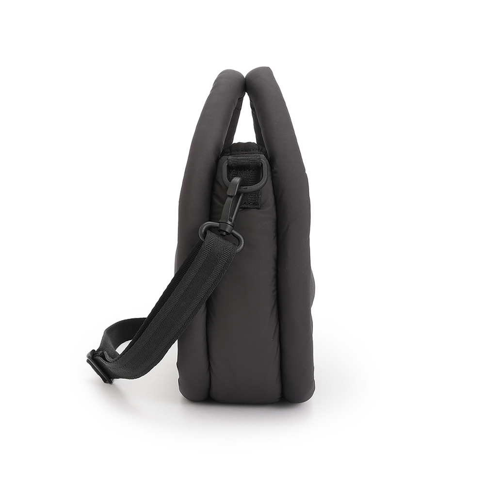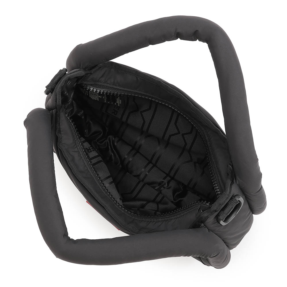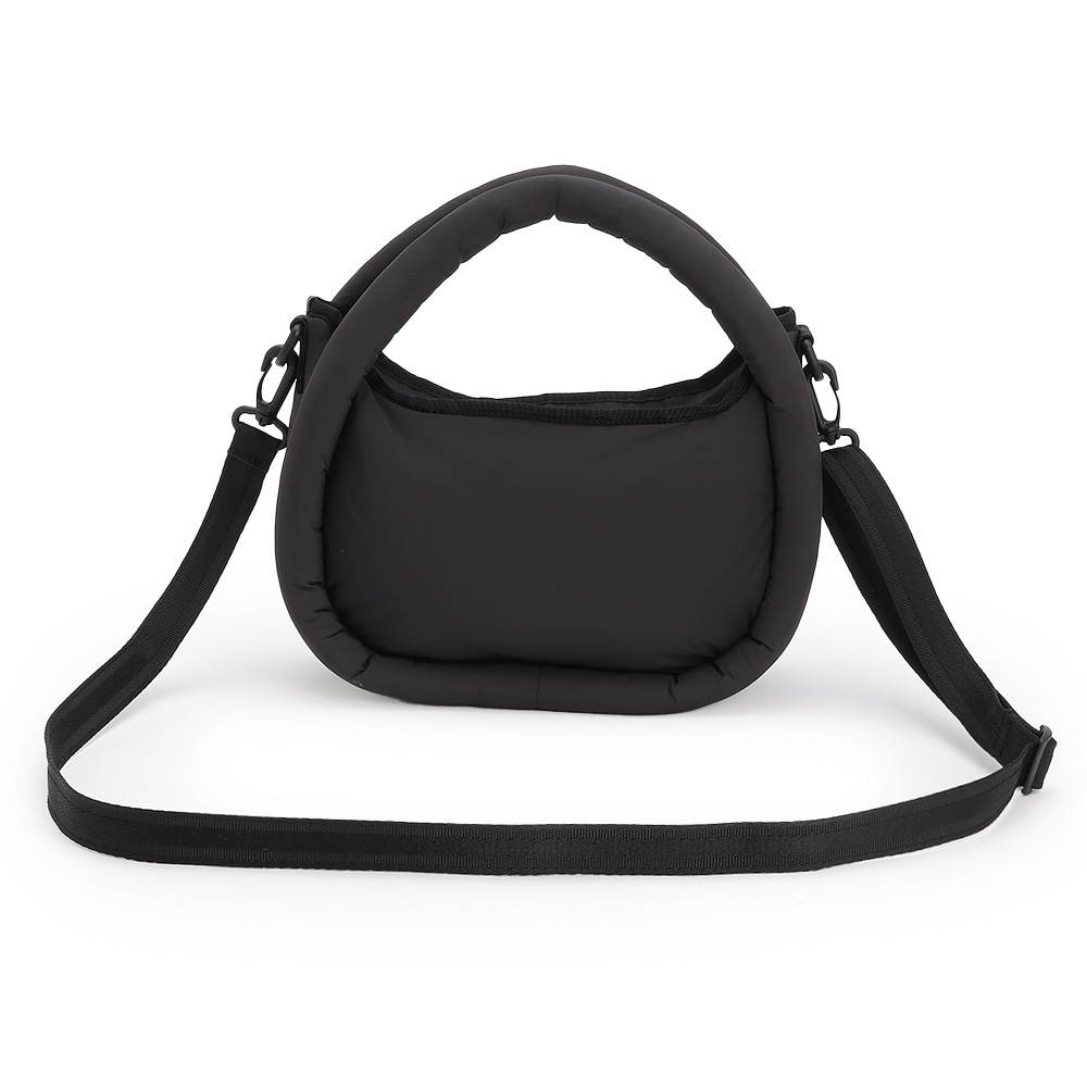 ポリエステルを使用した、クッションのように軽くて柔らかい半月型のバッグ。斜めがけができる取り外し可能のロングショルダーストラップつきです。大きく開くファスナー式開閉で、中にもファスナーポケットつき。500mlのペットボトルが収納できるサイズ感です。ブラックとホワイトの2色展開。商品画像の説明