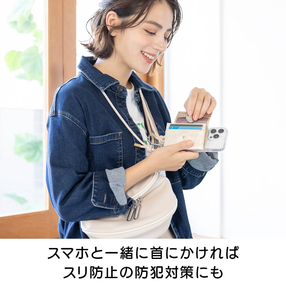 コンパクトながら必要最小限のお札や硬貨、カード類を出し入れしやすく分類収納できる設計。スマホへ装着しておけば、身軽に外出ができます。