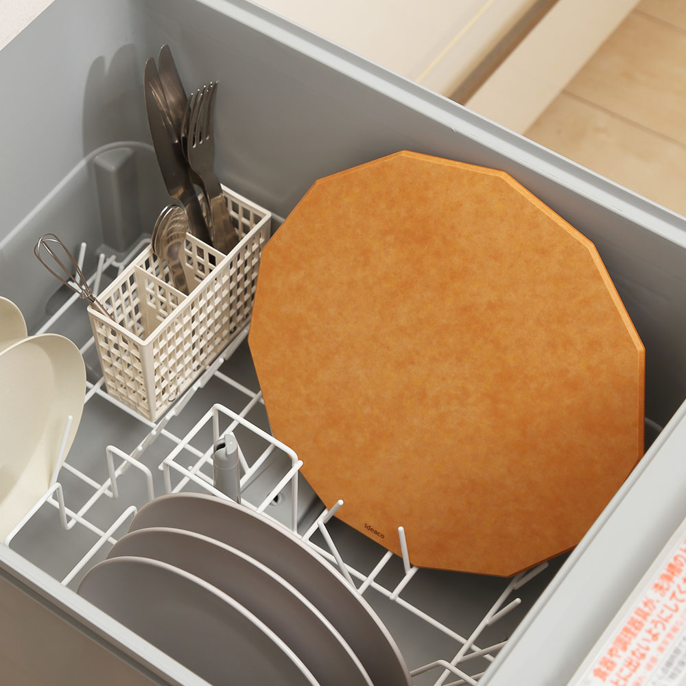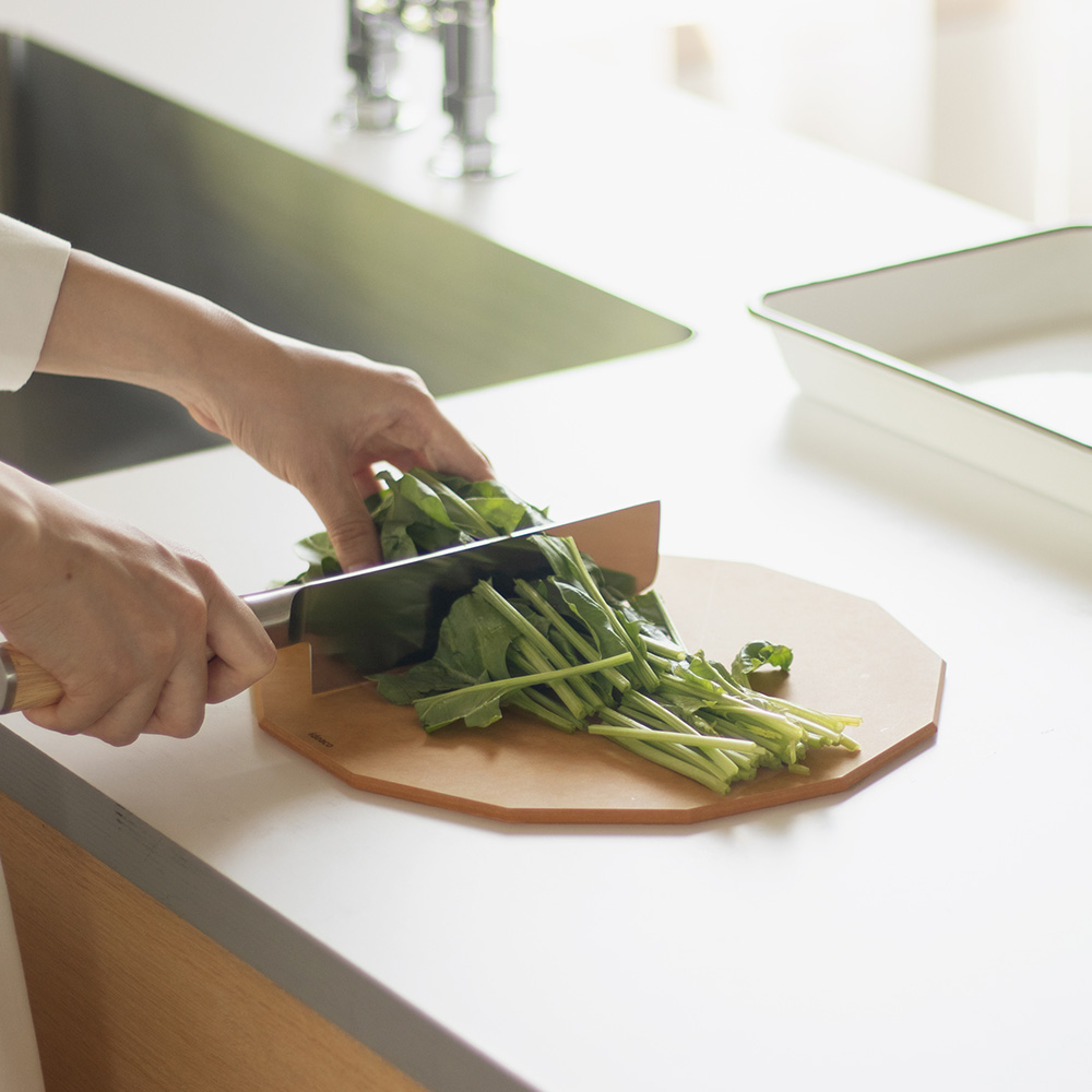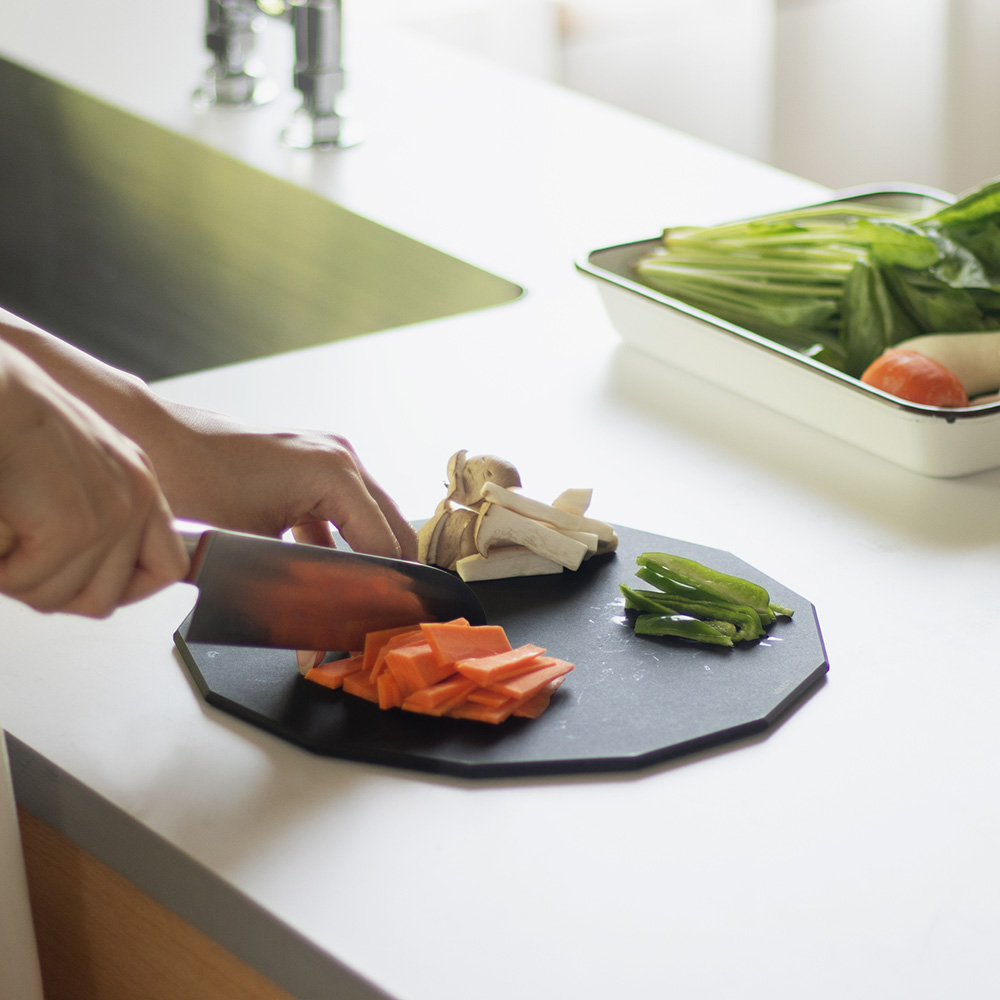 四角でも丸でもない"13角形"の形を採用。”13”という数字は、花びらの枚数やパイナップルや松ぼっくりの螺旋の数など自然界の中で多く見られ、世界でもっとも美しい螺旋と言われる"フィボナッチ数列"をもとに設計しています。角があるのでどの向きからでも切りやすく、奥行きがあるのでまな板の上を広く使えます。食材ごと、切りながらクルクルまな板を回していけば、まな板の上で食材の切り分けができ、バットに移したり、食材ごとに都度まな板を洗う手間も省けます。立てかけておいても転がることなく安定感があるのもポイントです。