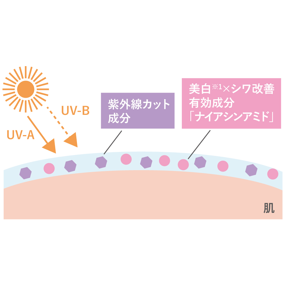 ※1メラニンの生成を抑え、シミ・ソバカスを防ぐこと (イメージ) UV耐水性★★取得。水に強いウォータープルーフ 耐水性を評価する合計80分間の耐水試験を実施しており、日常使いはもちろんのこと、レジャーシーンでも大活躍。