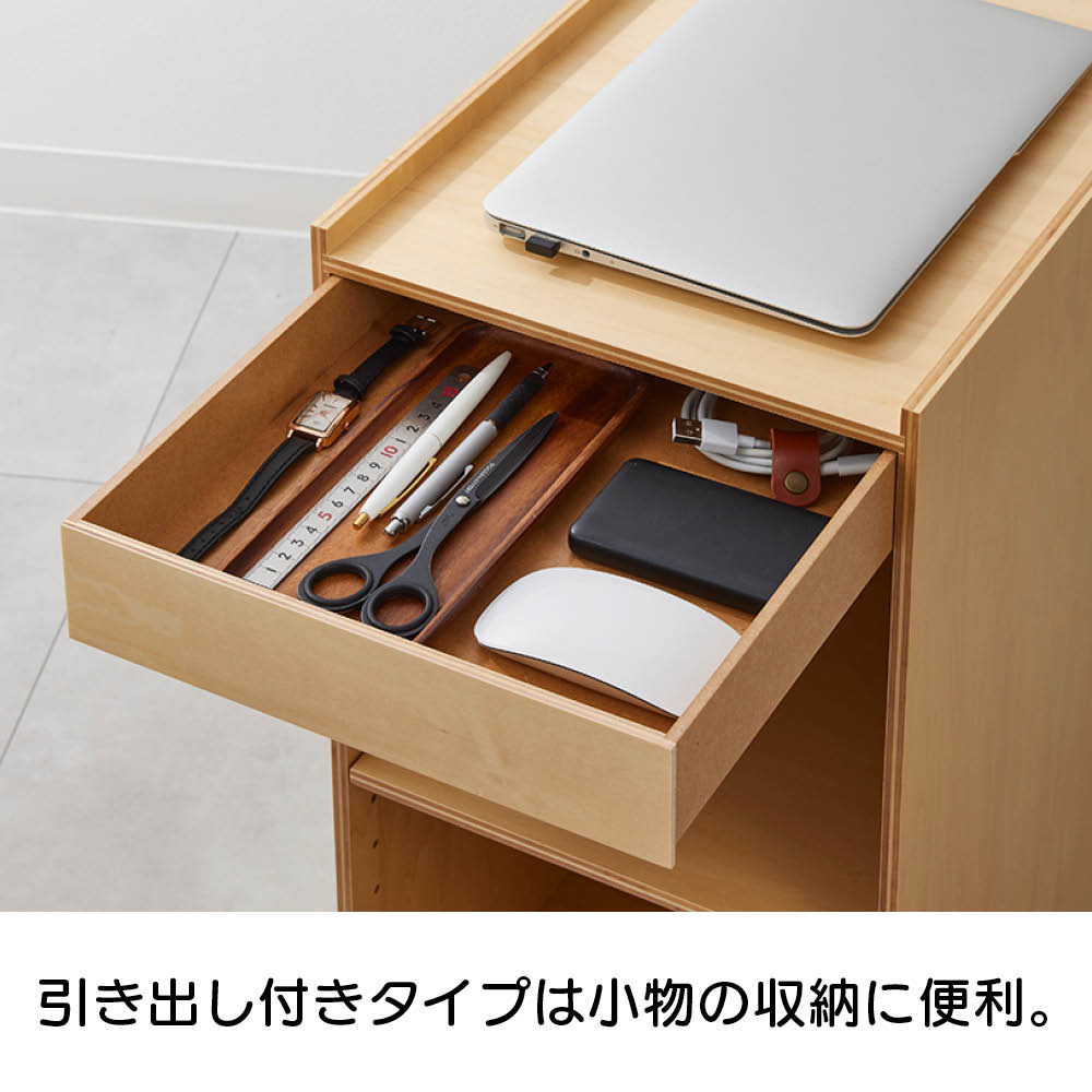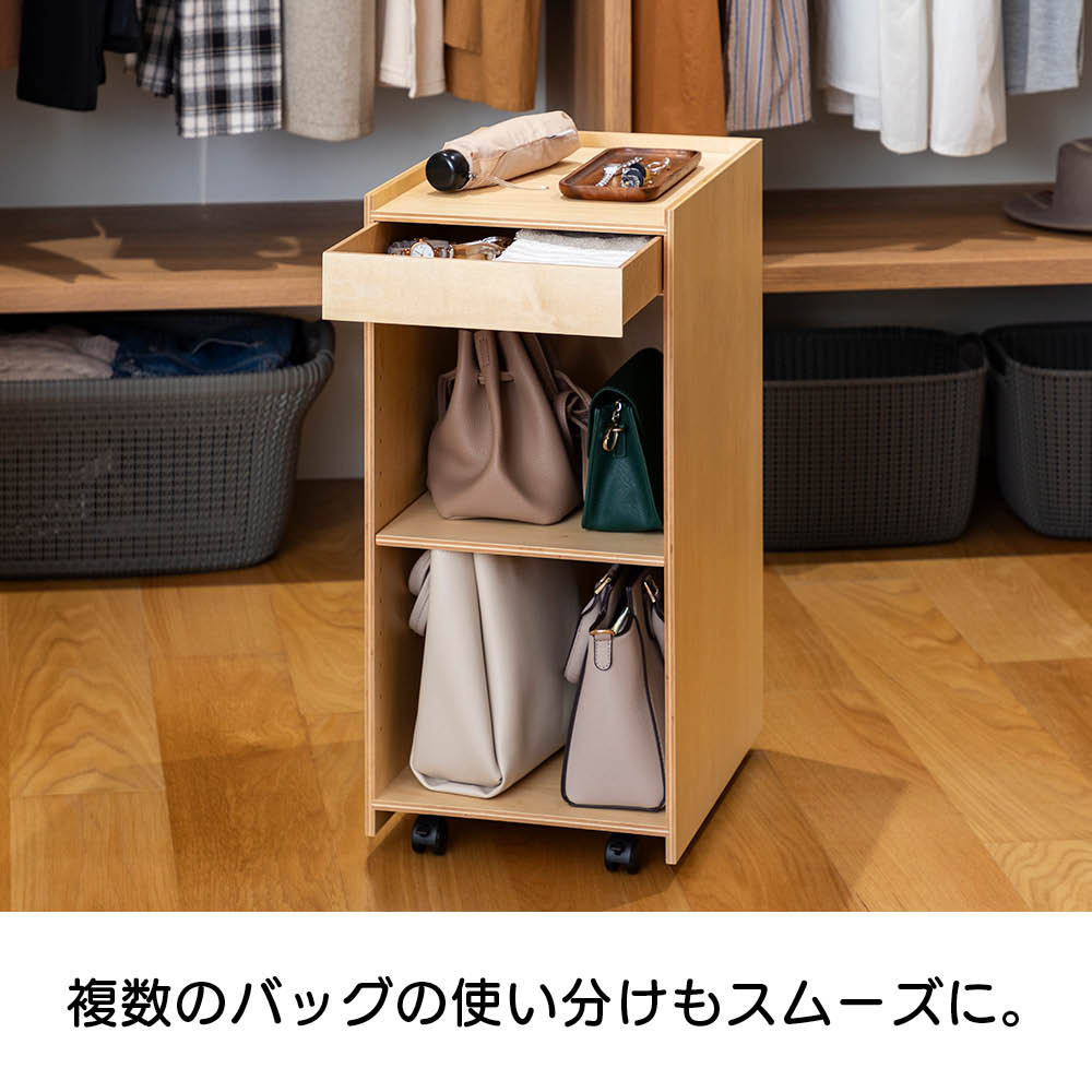 天板の上でバッグの中身をラクに入れ替えられるので、毎日のコーディネートや予定に合わせてバッグを変えるのも苦になりません。引き出しは、ハンカチやアクセサリーのほか、雨予報の日だけ持って行く傘などを入れておくのにも便利です。