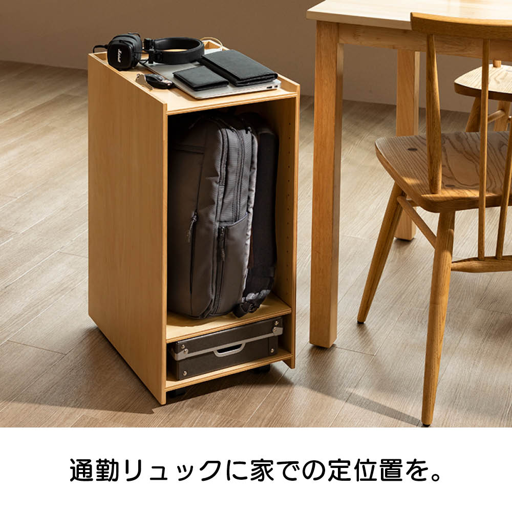 毎日使うバッグ、ついリビングに置きっぱなしにしていませんか? お家の中でのバッグの定位置が定まらない……、そんな悩みを解決するべく、お助けワゴンをつくりました。素材はどんなインテリアにもなじみやすい、ナチュラルな木目のシナ合板。無駄をそぎ落としたシンプルデザインだから、ライフスタイルに応じていろいろな使い方が可能です。