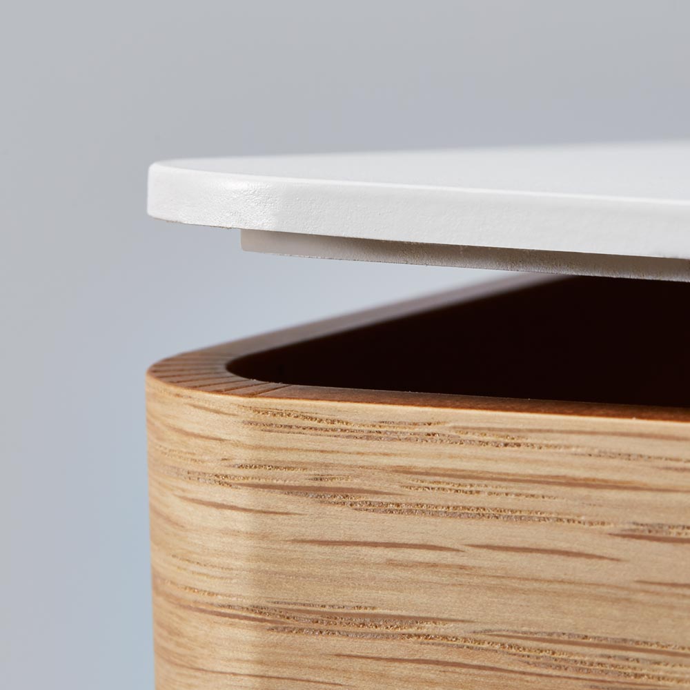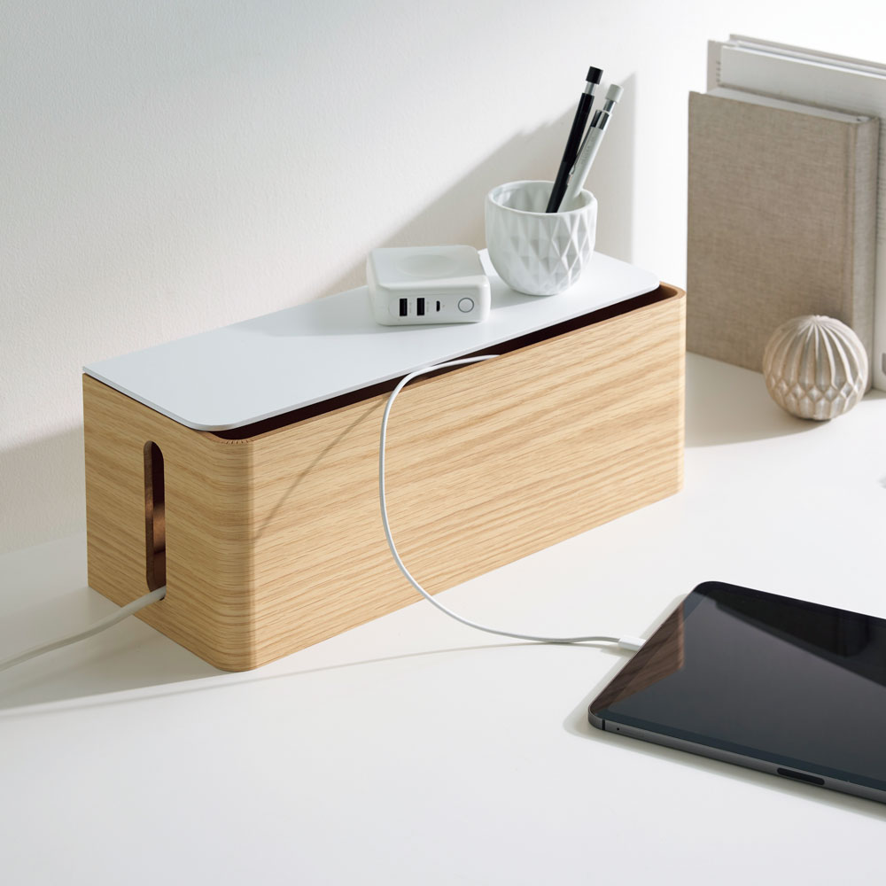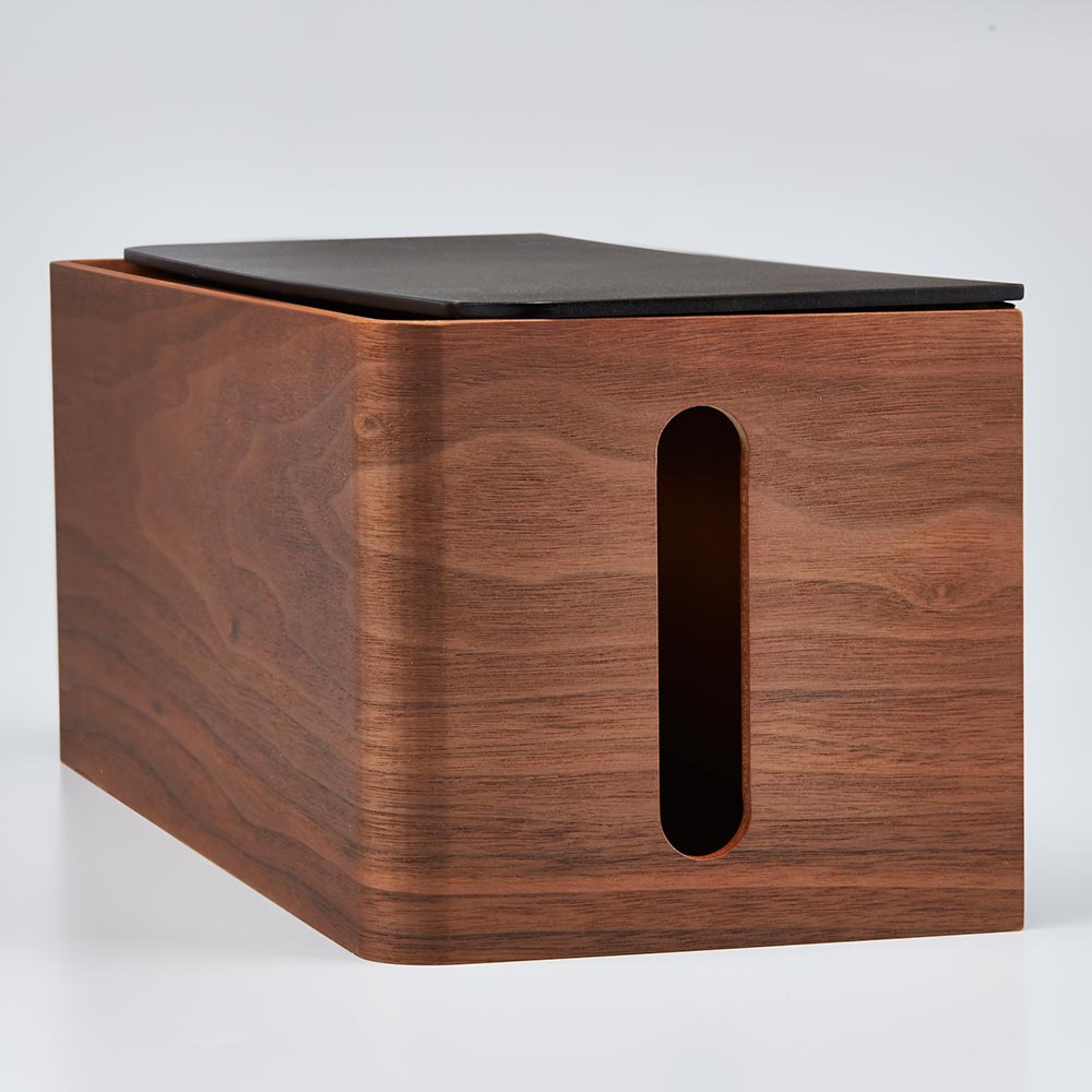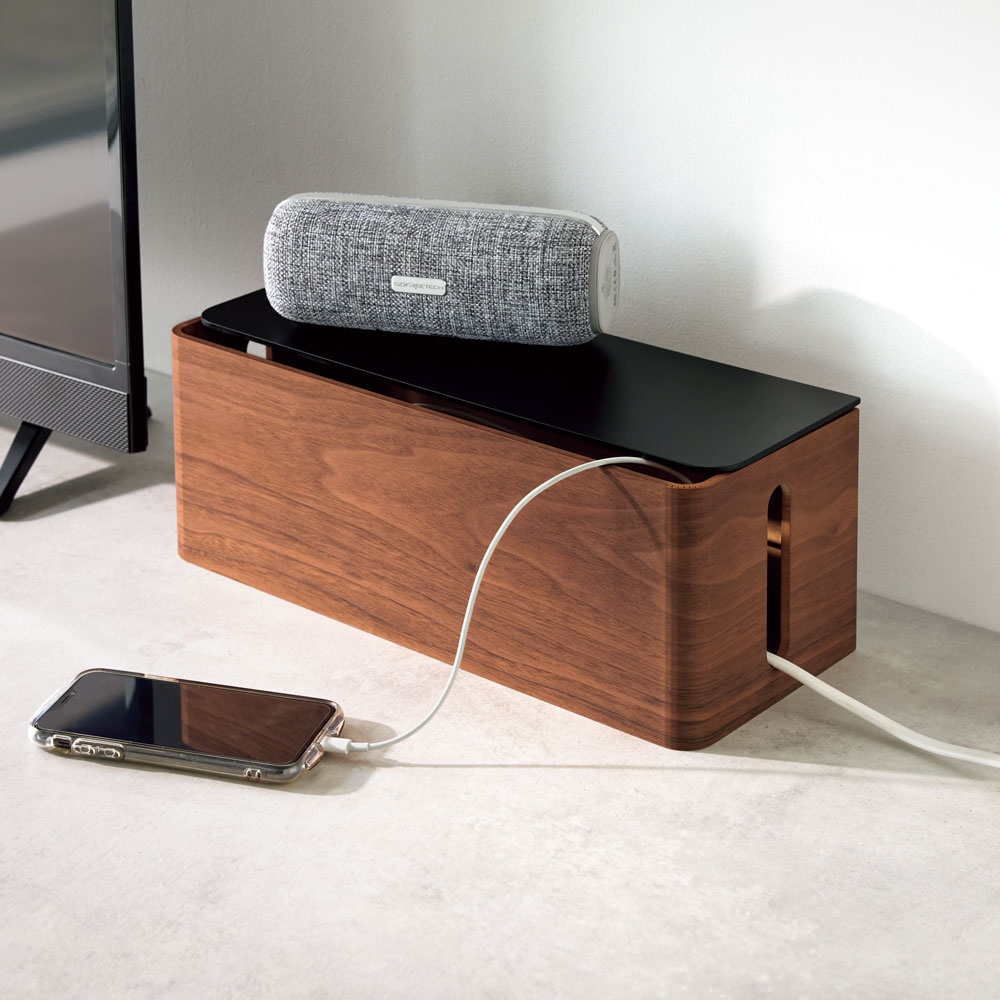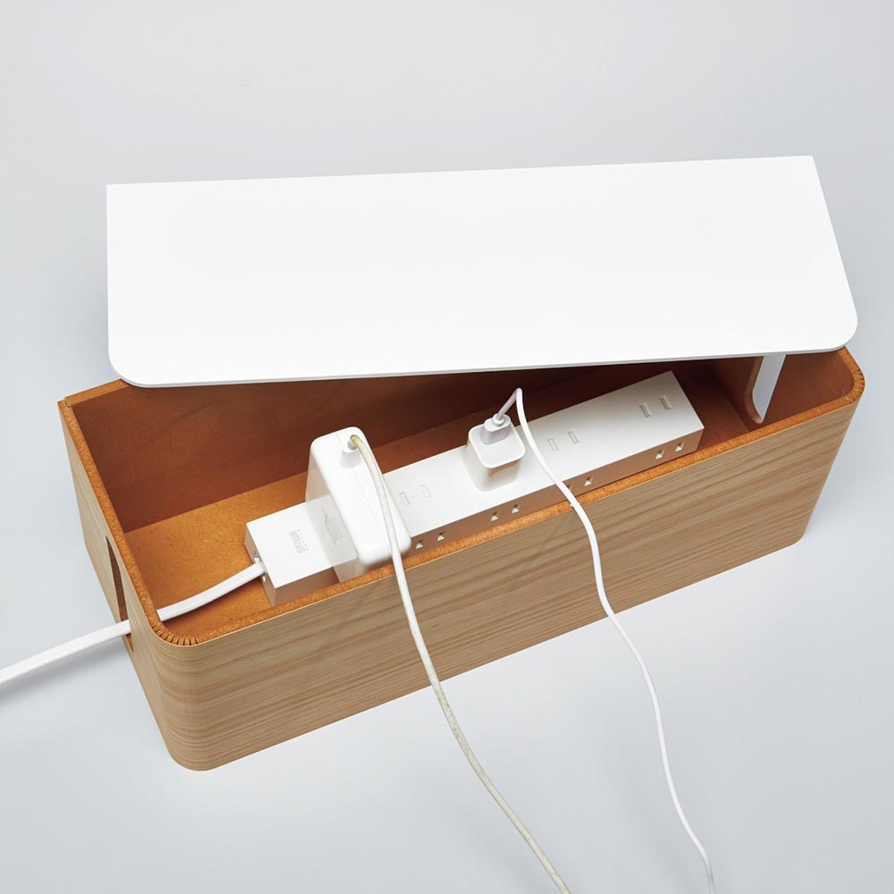 美観の妨げになる充電器などのケーブル類を曲木を使用したボックスで目隠し。美しい木目がインテリアにしっくり馴染み、ほこり防止や掃除のしやすさにも役立ちます。