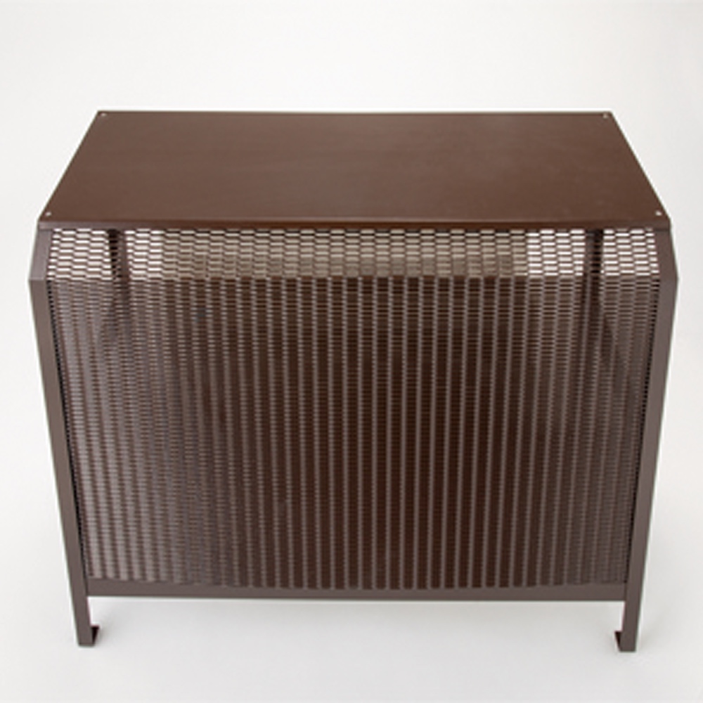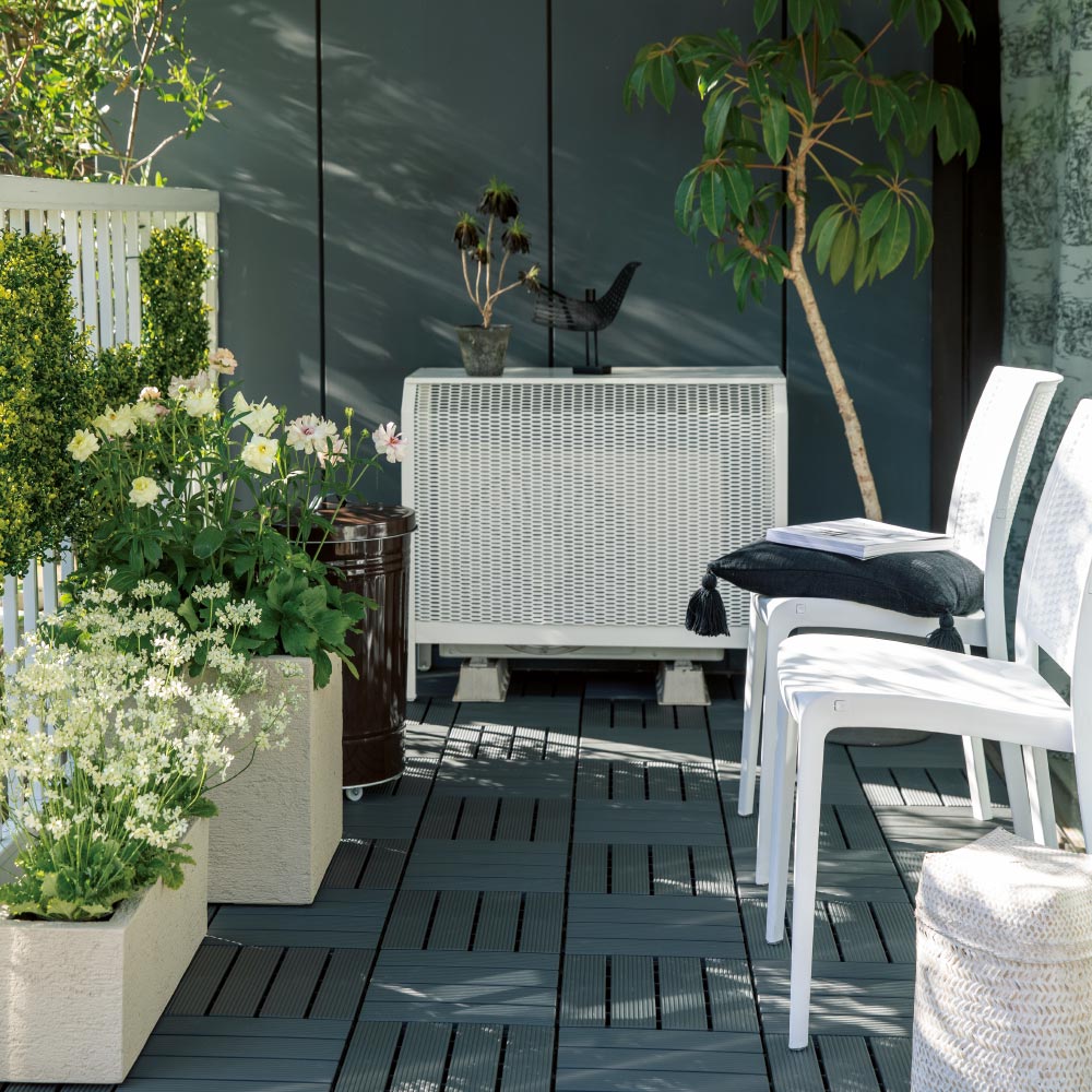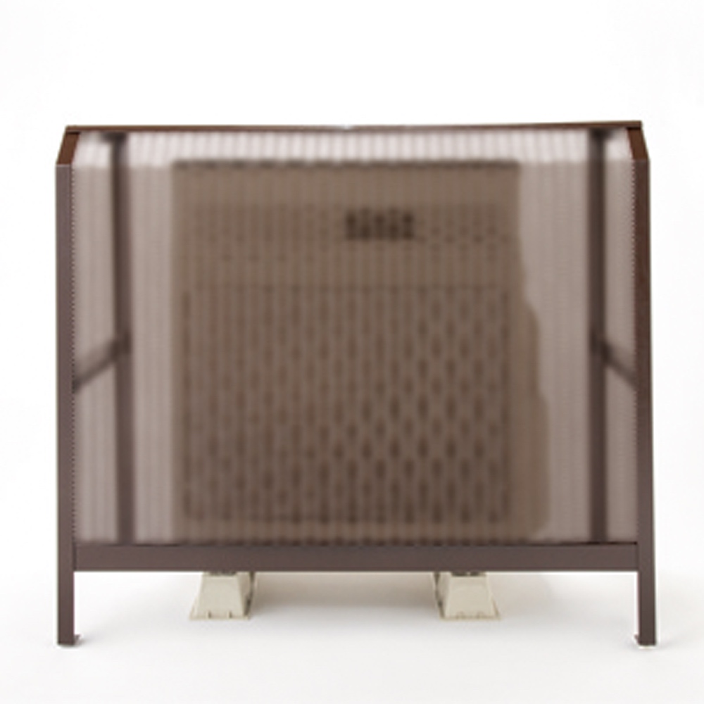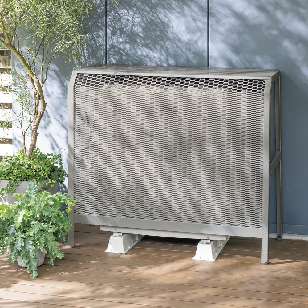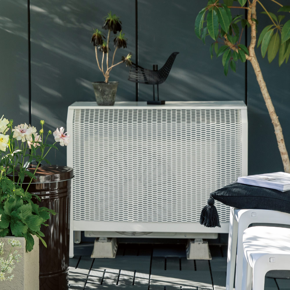 細かなルーバー状のメッシュで通気性をしっかり確保。視線の角度によって見え方が変わり、生活感が出がちな室外機をカバー。