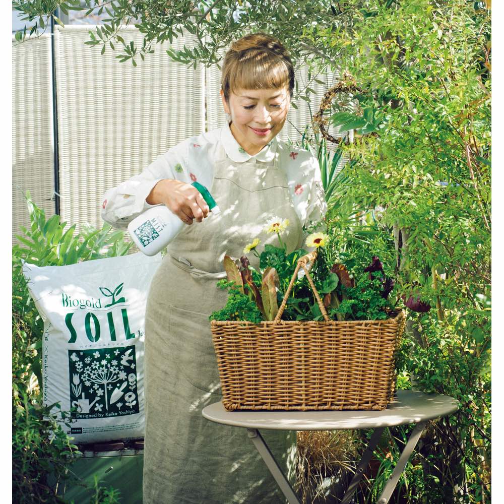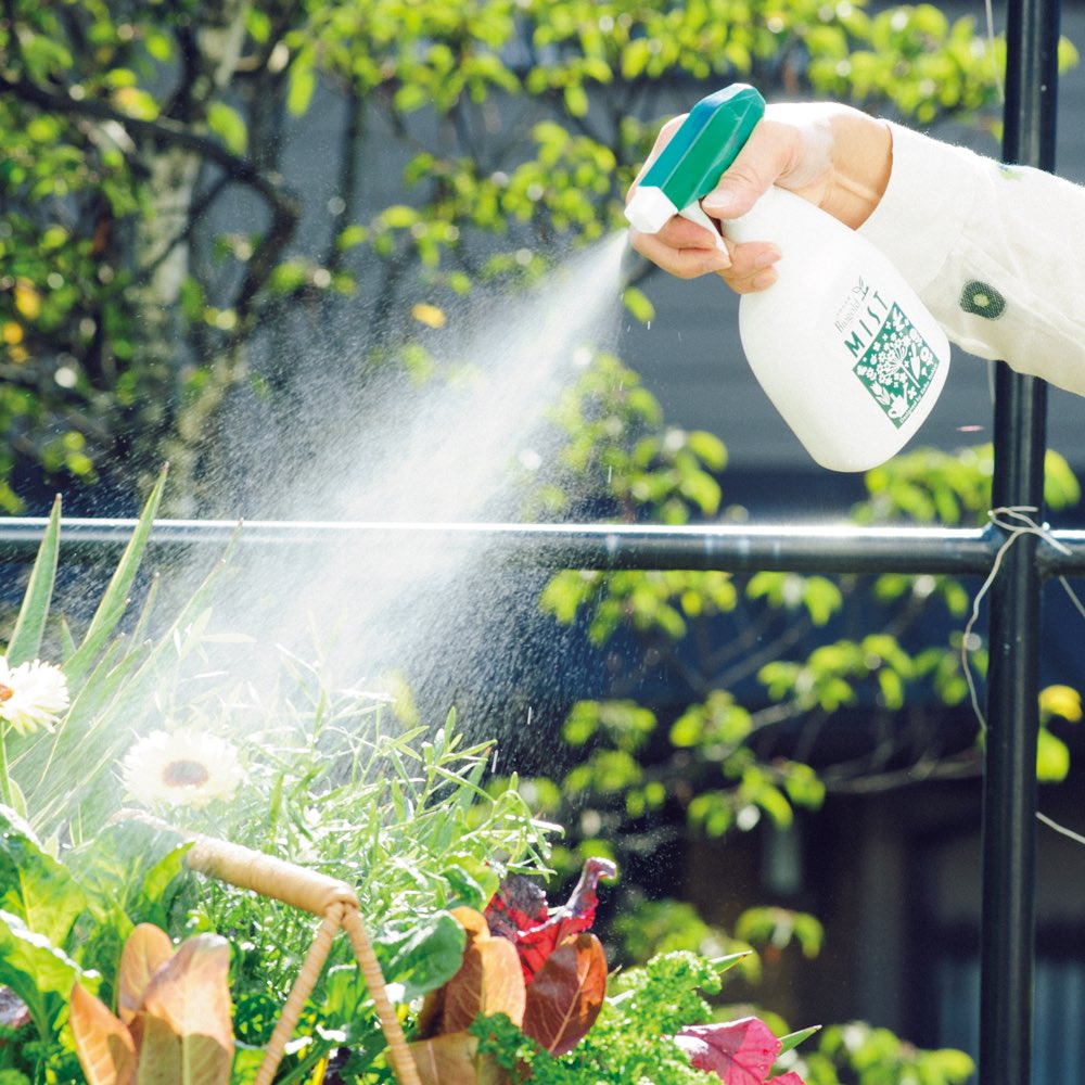 「手間なく元気な植物をつくるのにはいちばん。天然活性液だから、無農薬で育てられるのが嬉しいですね」。うどん粉病が気になる植物のケアにも取り入れて。