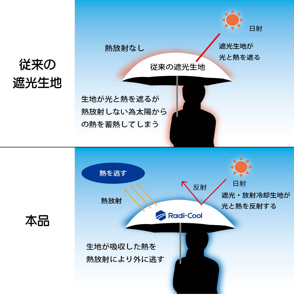 • 熱を遮りながら外に放射することで傘内の温度上昇を防いでくれる