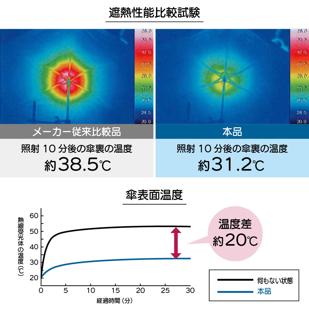 • 照射試験でメーカー従来の晴雨兼用傘と比較。約10分間で体感温度の違いは歴然