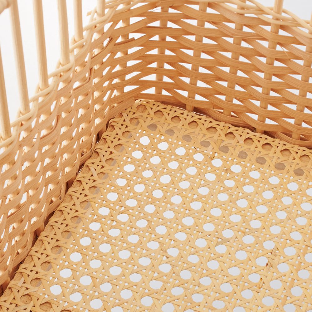 上段の収納部と下段のバスケットの底、および本体2段目の底部分は耐久性が高く、見た目も美しい籐カゴメ編みです。