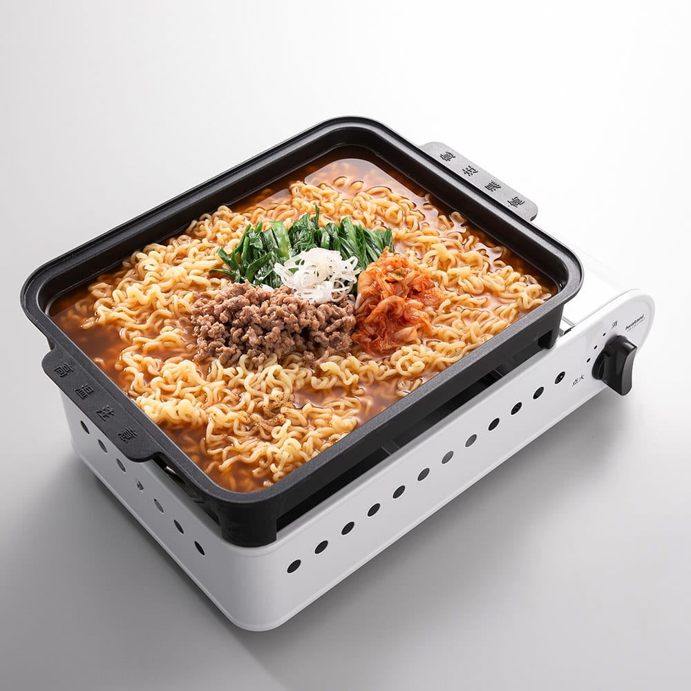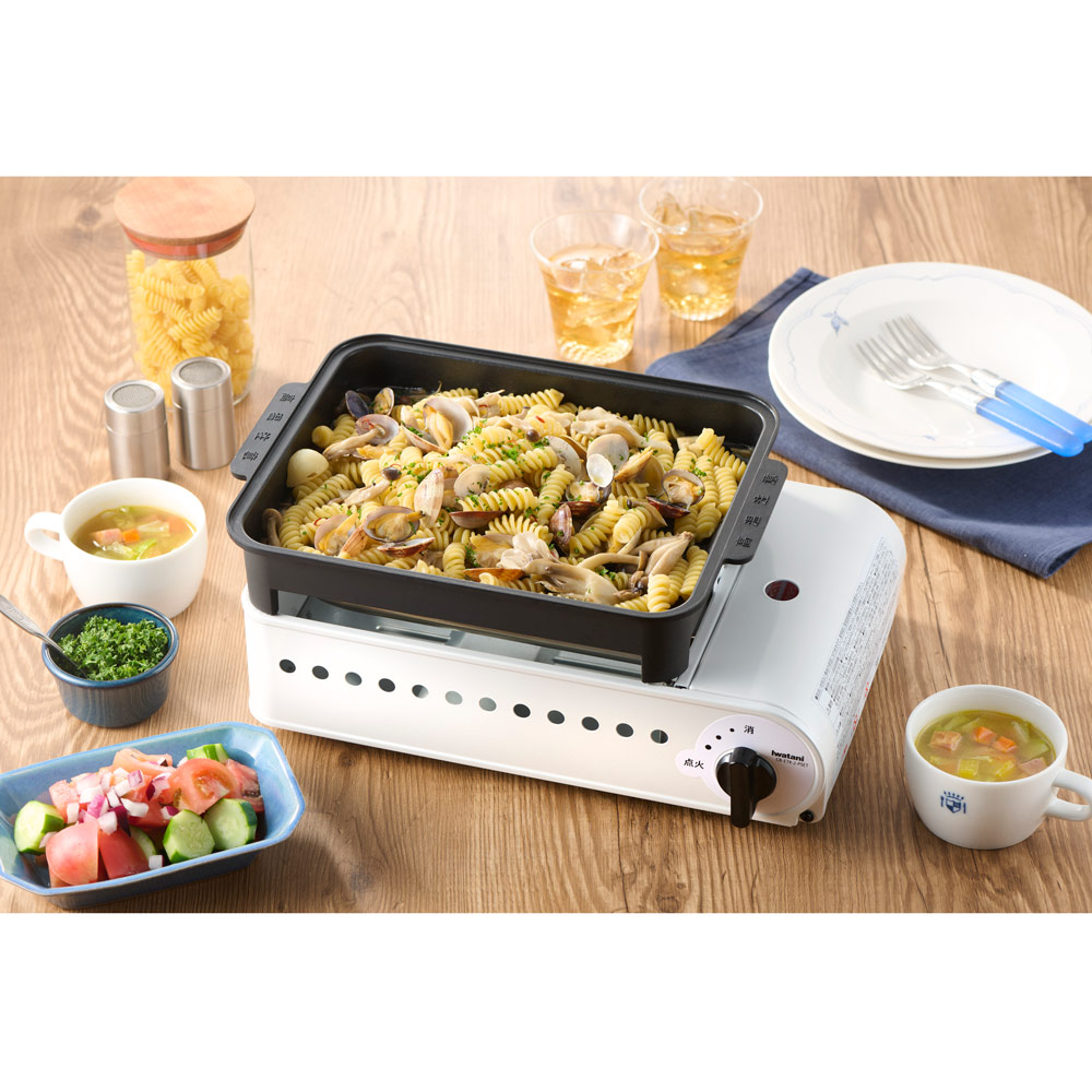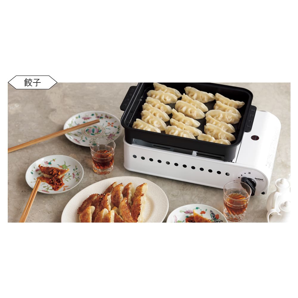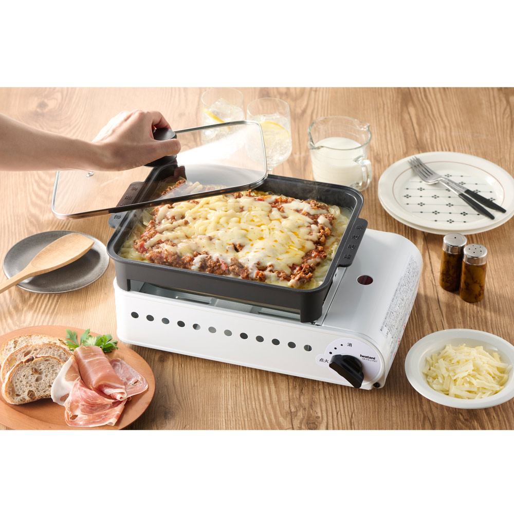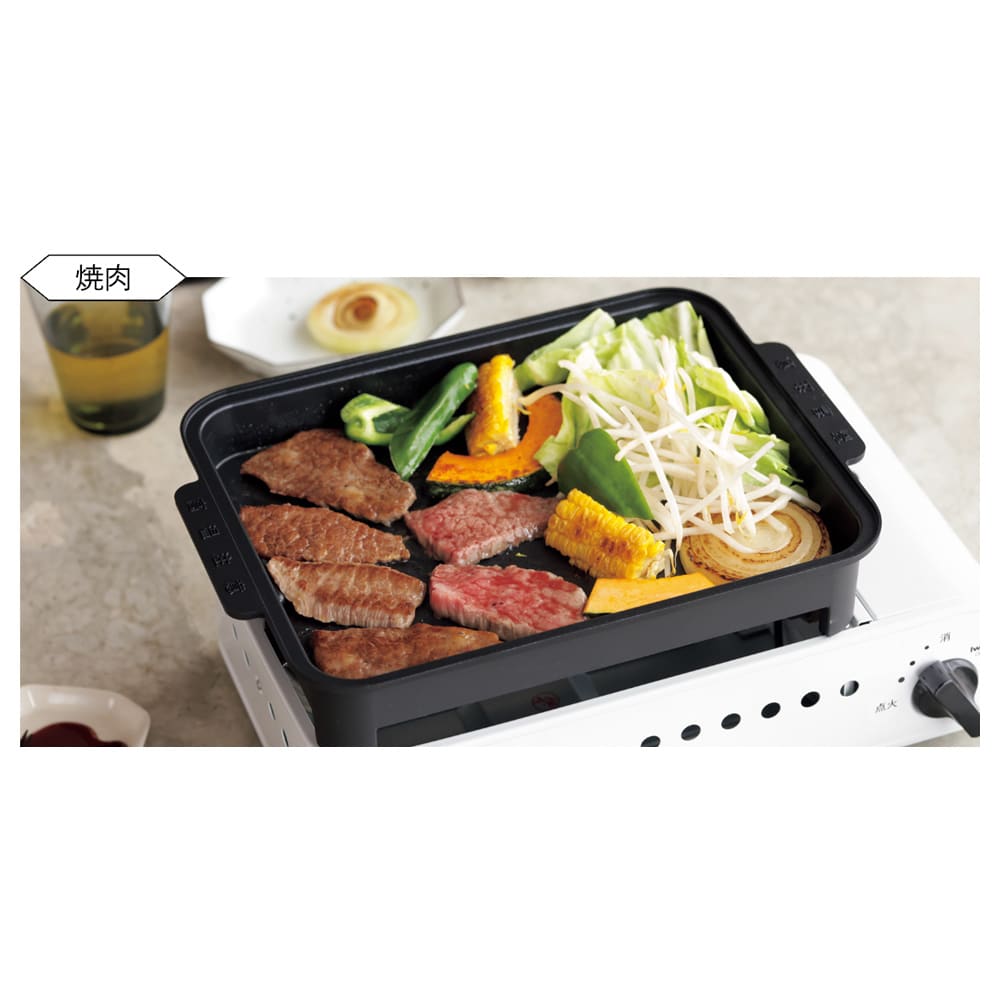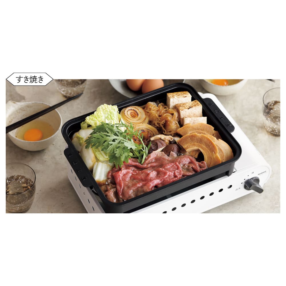 カセットコンロに定評のある「iwatani」と一緒に企画。約3cmのプレート&ガラスふたもセットだから、鍋料理や焼肉にも活躍!