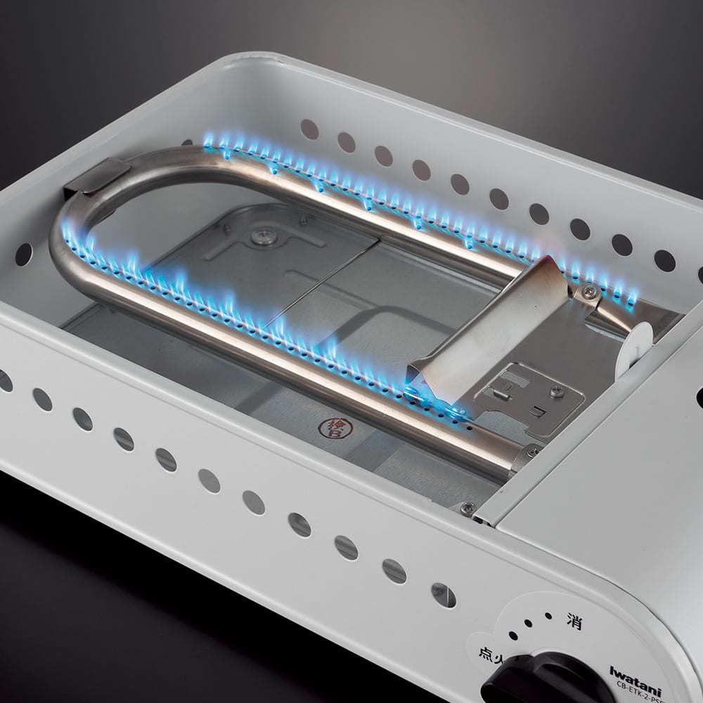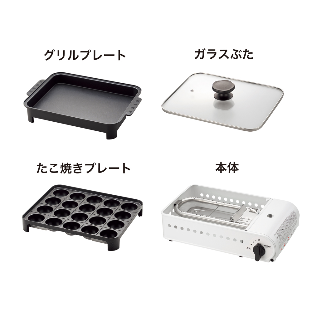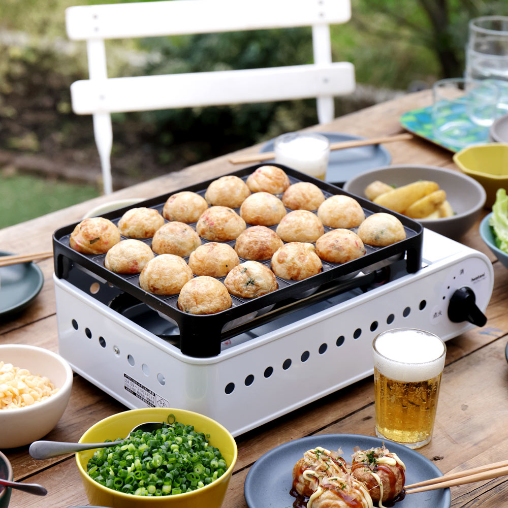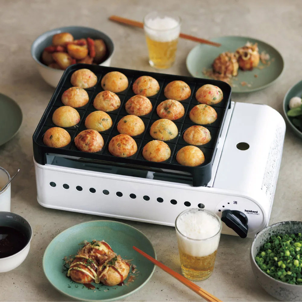 カセットこんろでおなじみのiwataniと一緒に企画した、たこ焼きがおいしく焼ける「プロたこマルチ」。ガス火だからできる外カリッ中トロ~なおいしいたこ焼き。