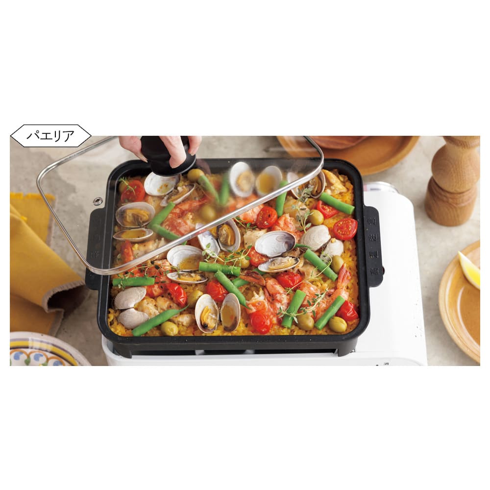 プレートで炒めて、そのまま炊いてパエリアも。ガラスぶたで中が見えるのも楽しい!