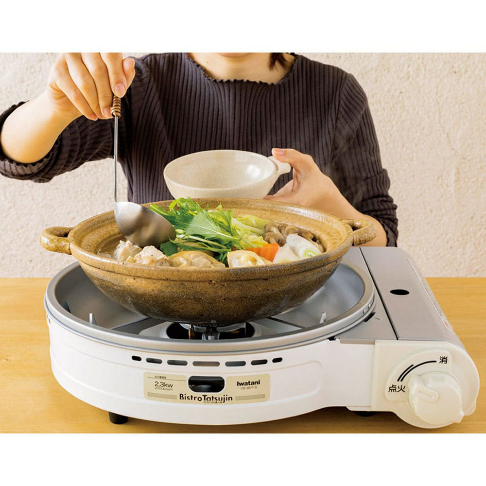 お手持ちの土鍋を置いても炎がむき出しにならず、安心して鍋を楽しめます。火力は側面の小窓から確認可能。熱源が覆われているため、風のある屋外でも火が消えにくいのも特徴です。 ※画像は従来品のビストロの達人3です。
