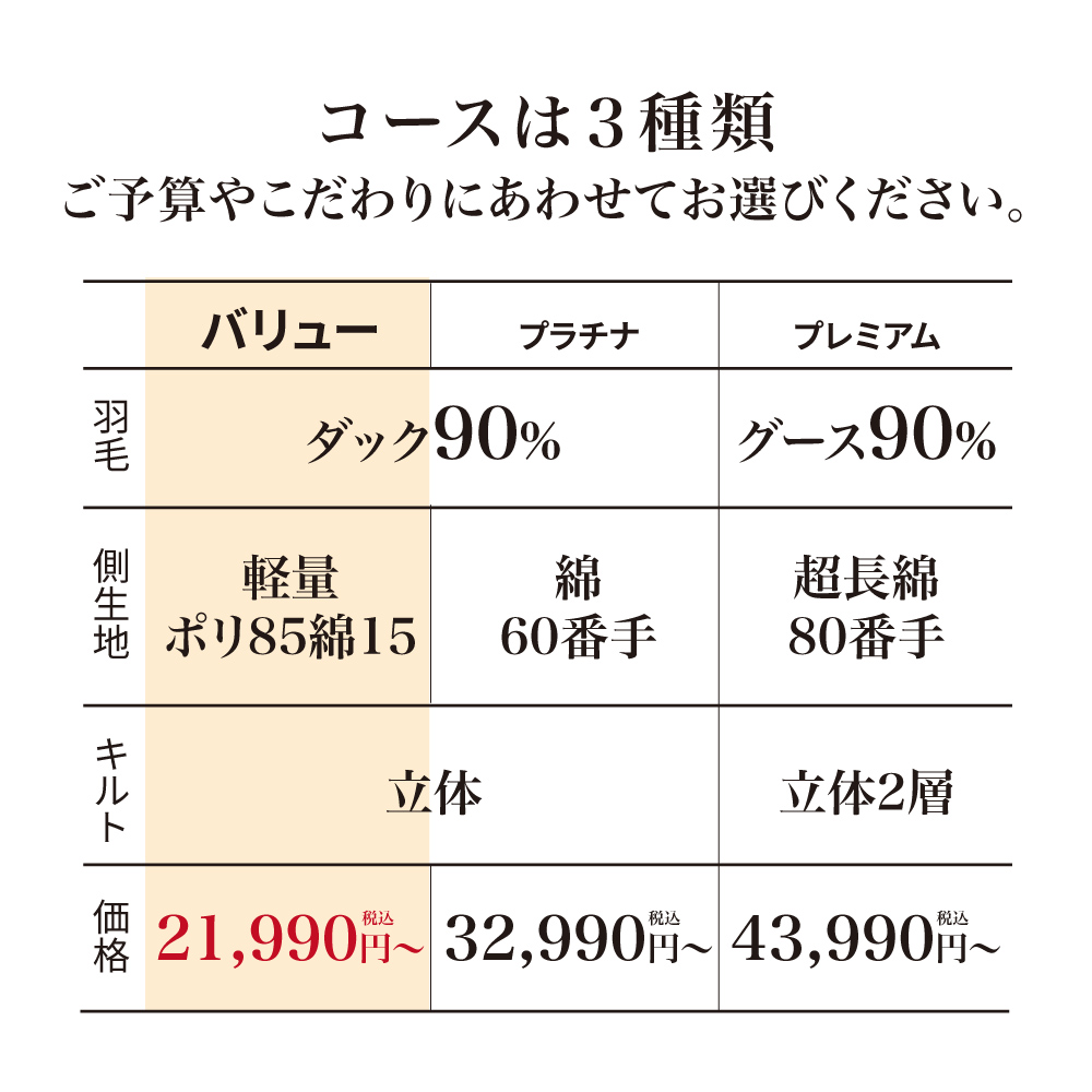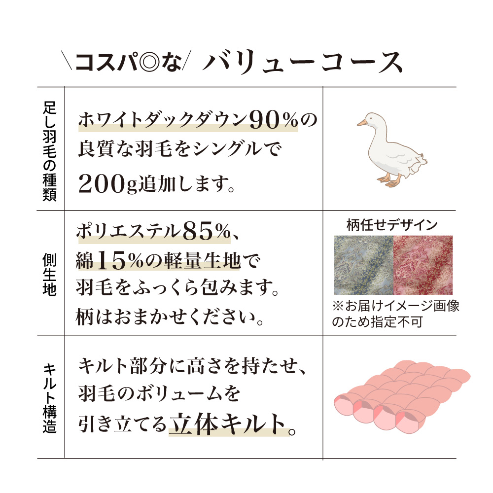 ※羽毛が足りない場合は、足し羽毛(有料)のご連絡をさせていただく場合があります。