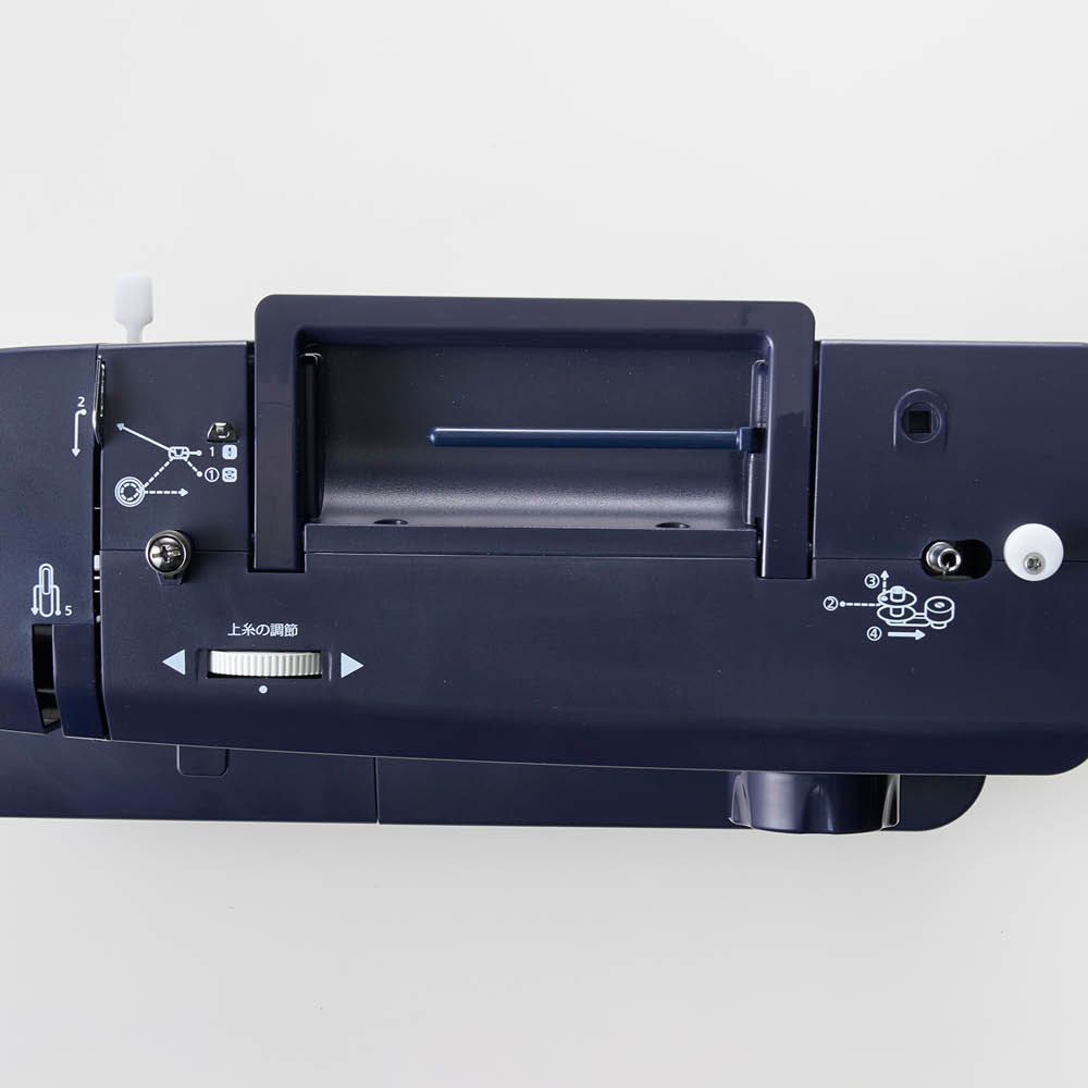 ■付属品:ジグザグ押え(ミシン本体にセットされています)、ファスナー押え、ボタンホール押え、ボタン付け押え、三角ドライバー、リッパー/ブラシ、針パック、ボビン、シームガイド、糸コマ押え(大・小)、補助糸立棒、糸コマ座、ソフトカバー、使用の手引き