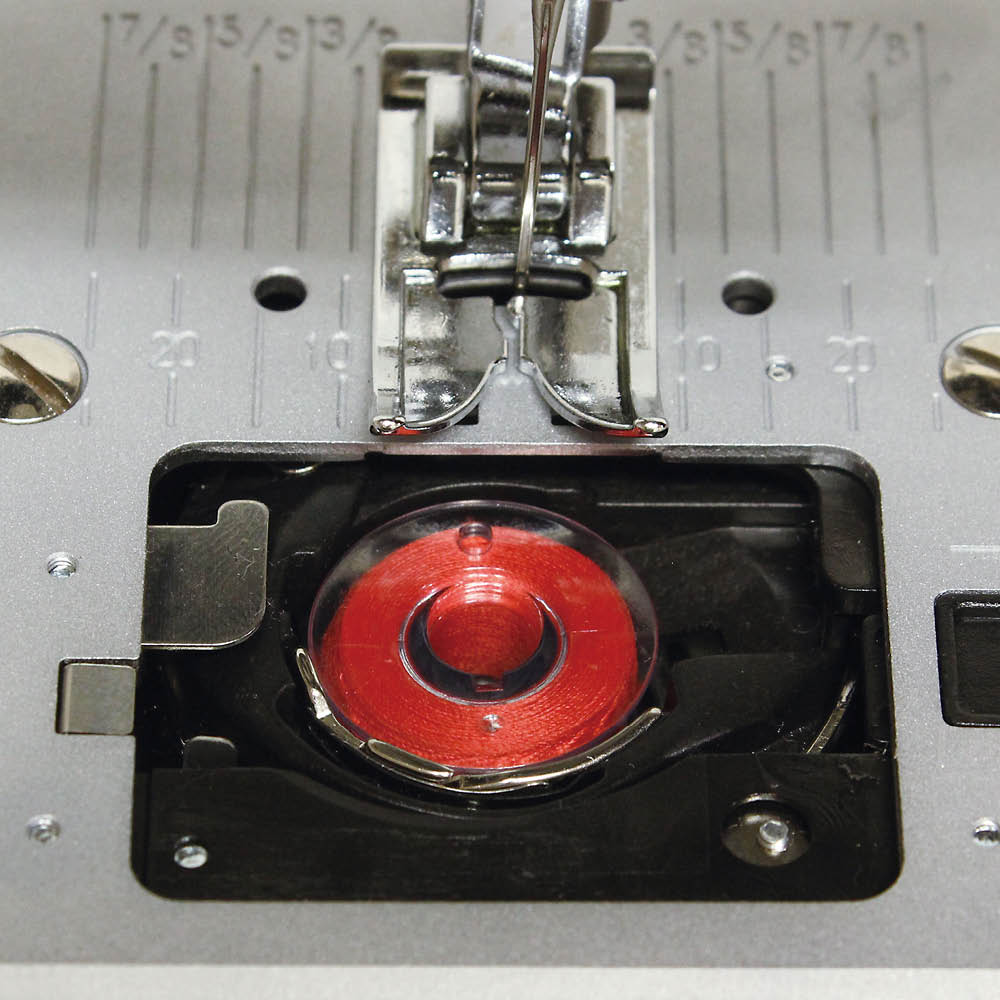 細かくて意外と手間がかかる針穴への糸通しも、レバーを下げるだけでサッと完了。自動針穴糸通し機能を備えたこのミシンなら、準備に時間を取られず、すぐに縫い始められます。ちょっとした作業でもストレスなく進められ、視力が気になる方にも安心の機能です。糸絡みを防いで仕上がりもきれいに。安定感のある水平全回転釜を採用
