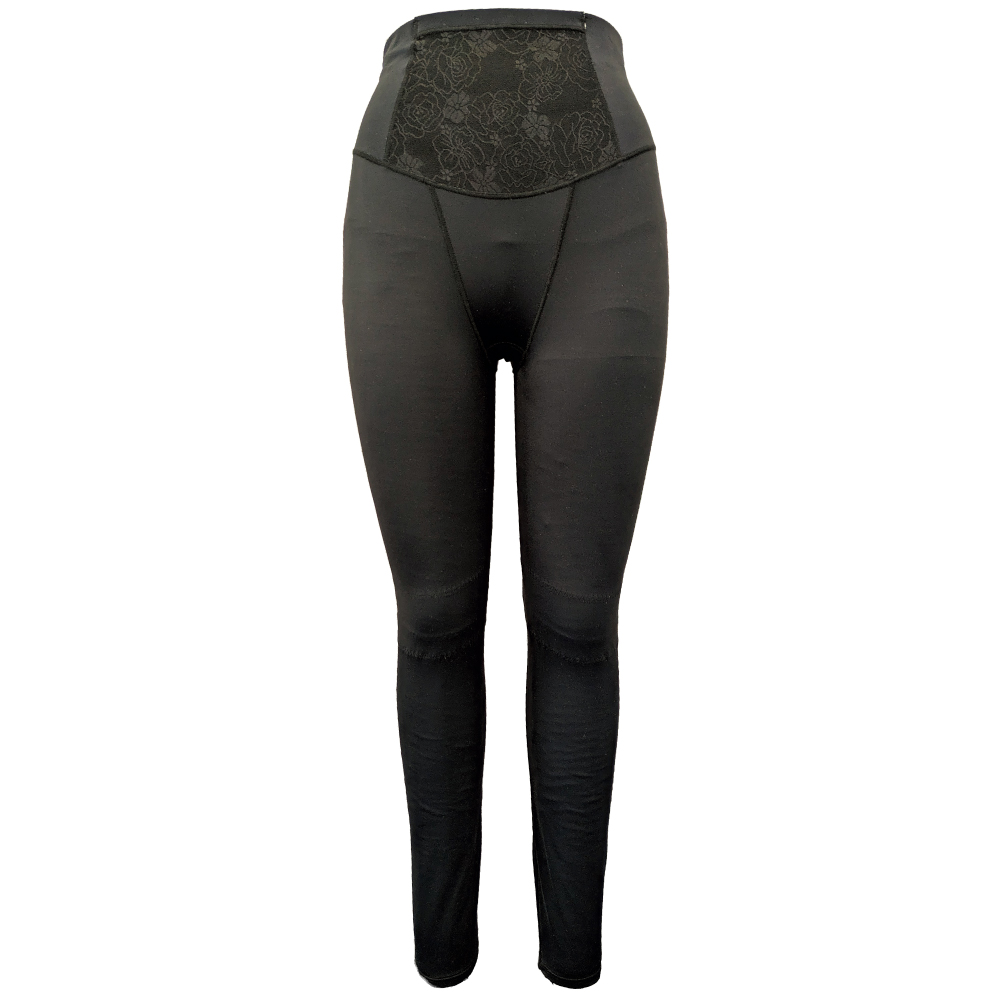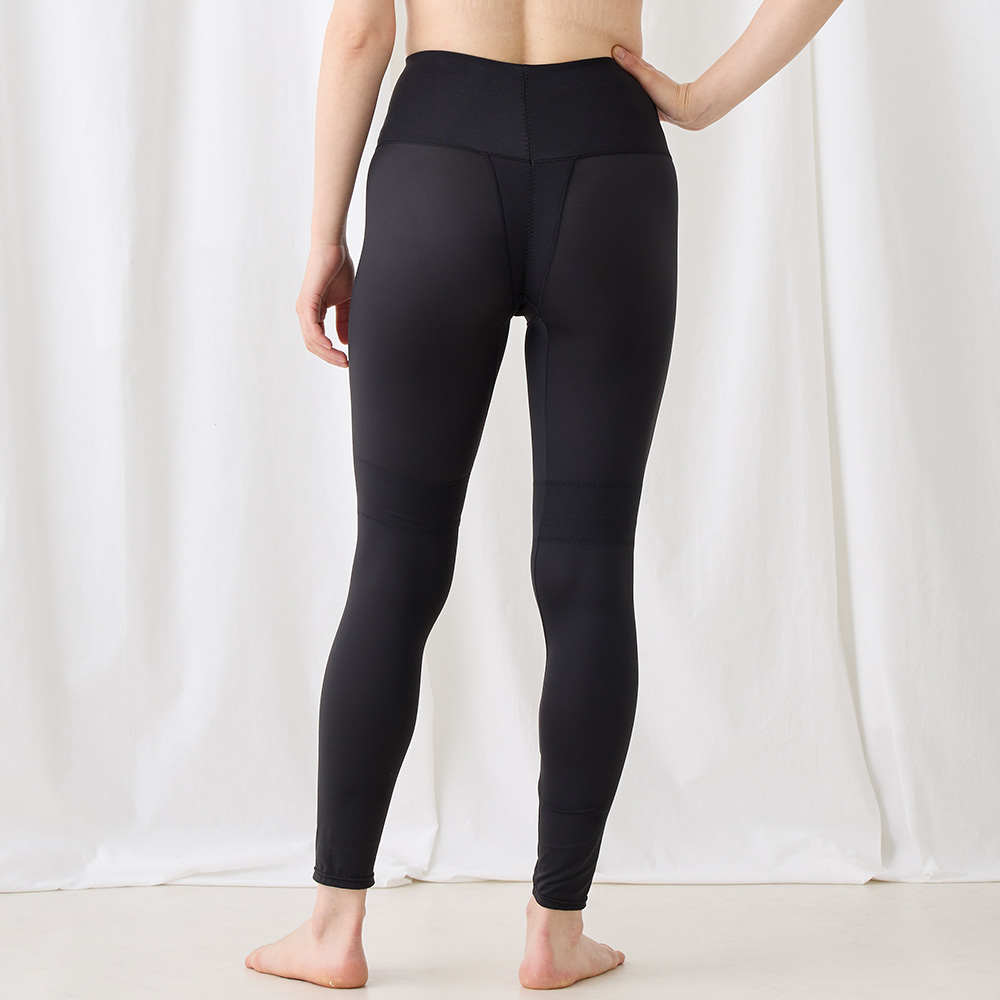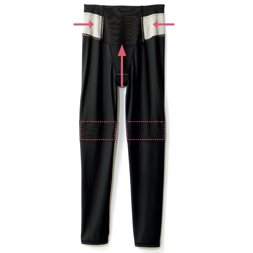 [裏面] レギンスがずれにくくなる滑り止めシートで骨盤まわりと引き上げに骨盤底筋のサポート力をアップ。 T字型のパネルが骨盤底筋を引き上げてサポート。 膝上に配した2重構造のパワーネットが膝の負担を軽減。 ※イメージ