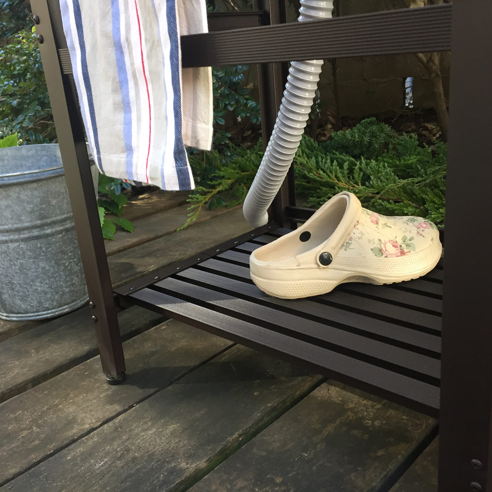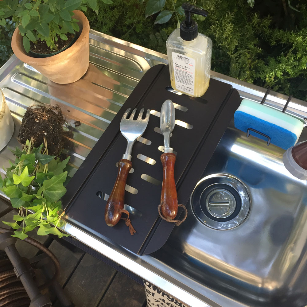 ・洗い途中の食器などを置ける水切りや、スポンジホルダーもご用意。屋外に便利な炊事場が完成!・タオル掛けや、棚板など、収納にもばっちり配慮。