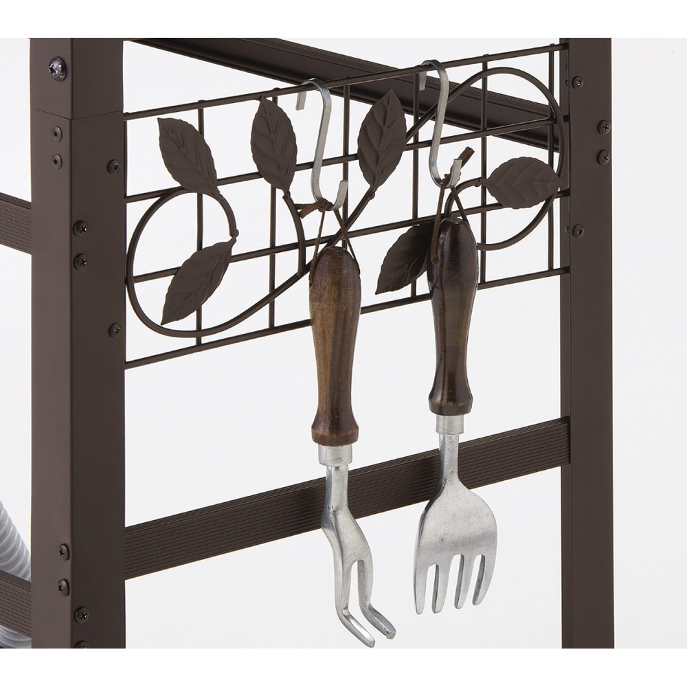 サイドのフックにはガーデンツールを掛けて収納できます。