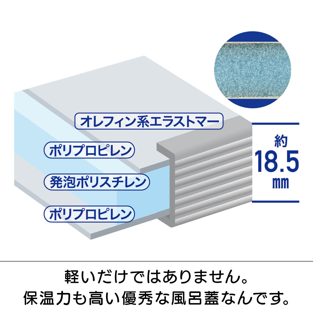 中身に使われている発泡剤は建築現場でも実際に使われている断熱素材です。だからお湯の熱を逃がさず、寒い冬でもきっちり湯温をキープしてくれます。