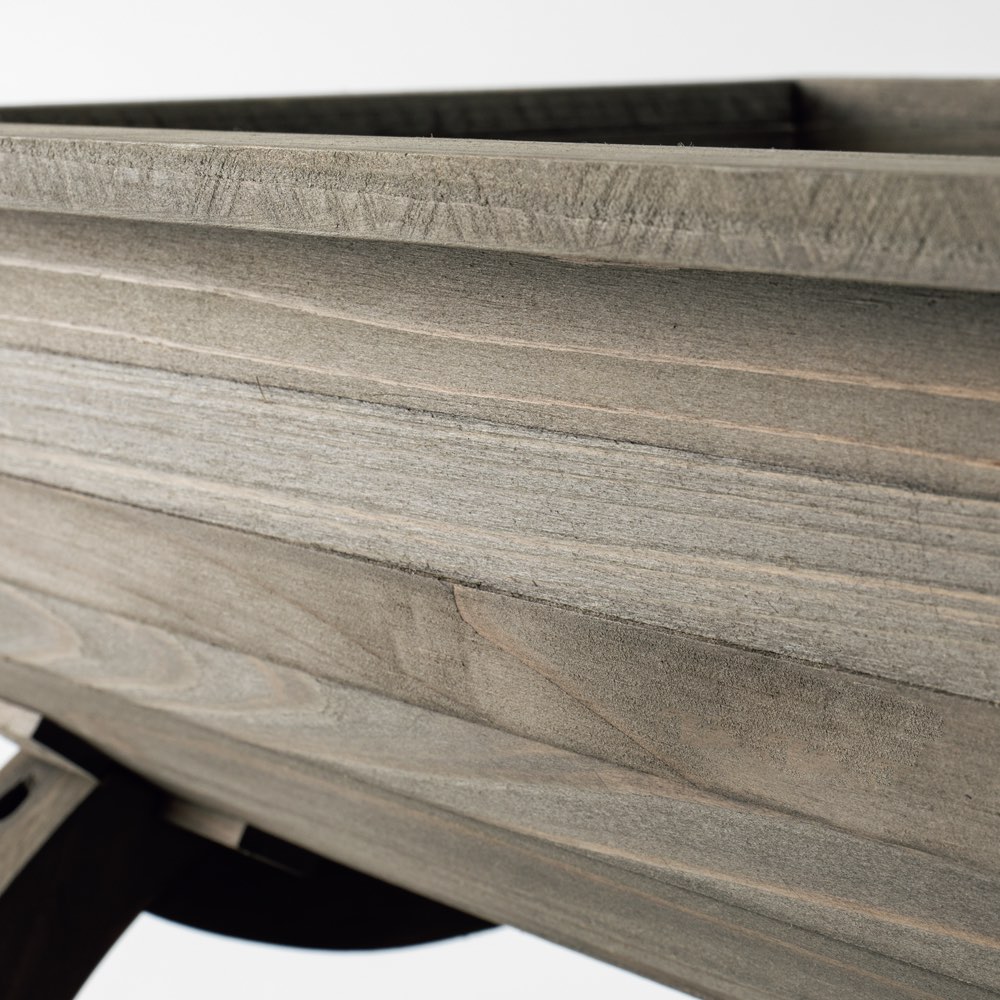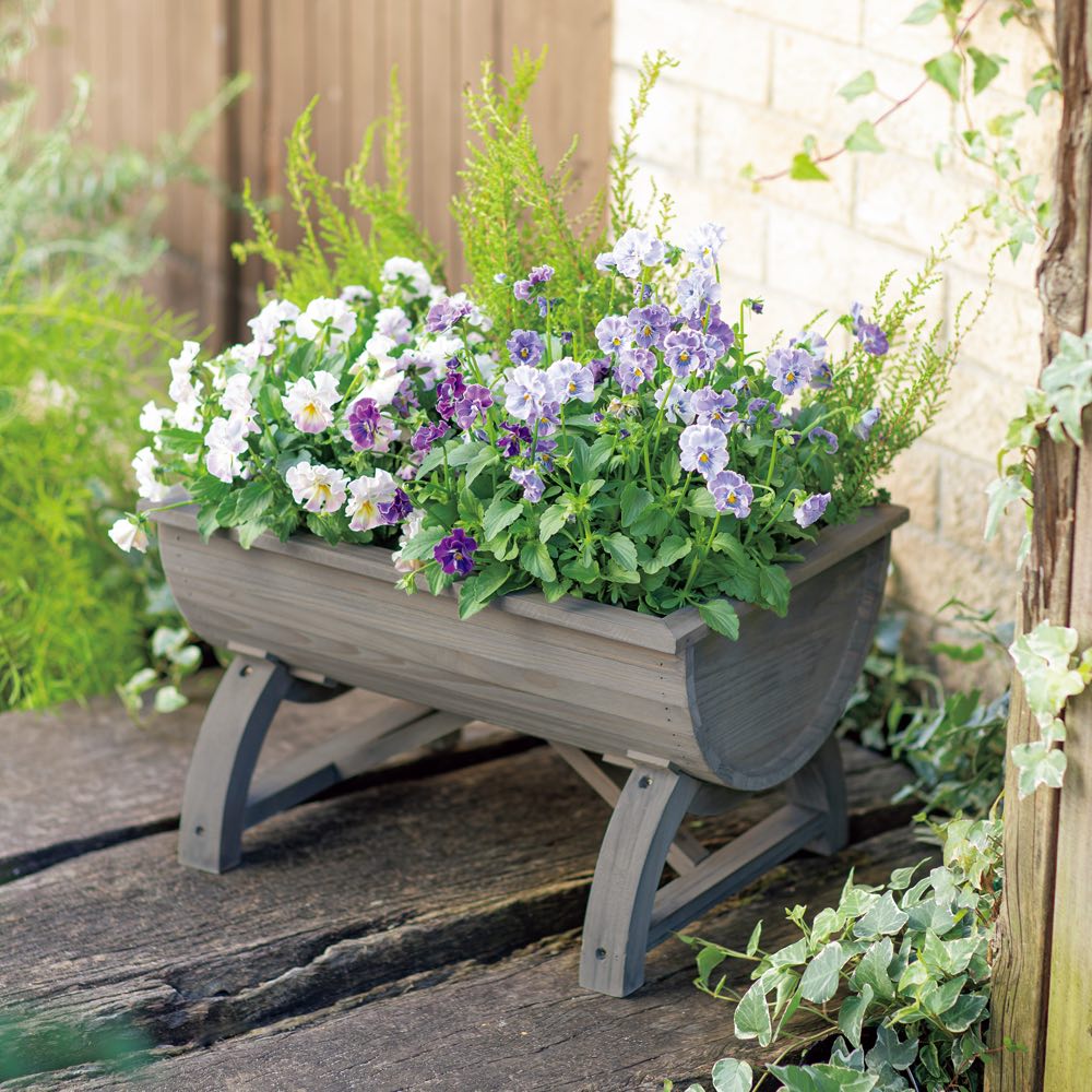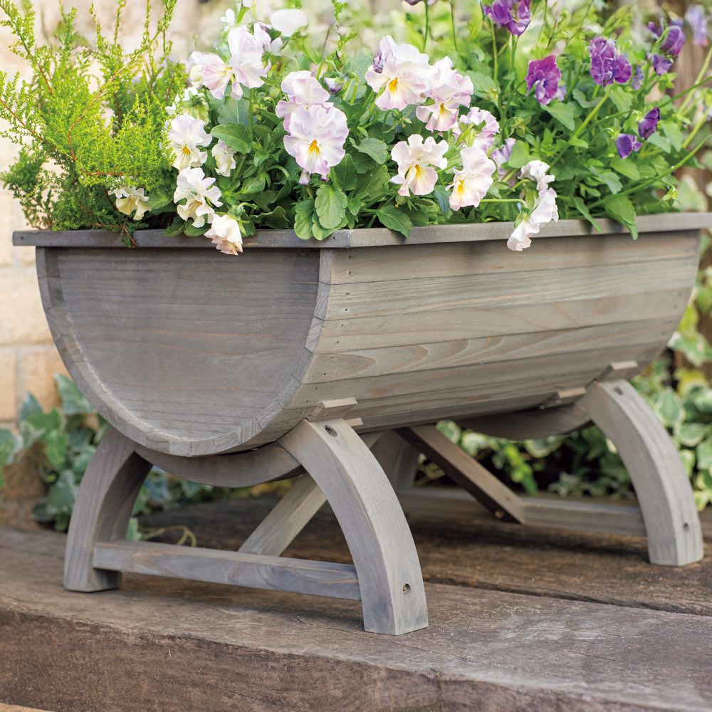 樽をすっぱり二つに割ったスタイルの天然木製。風格ある佇まいで、ガーデンに成熟した落ち着きある雰囲気を漂わせます。