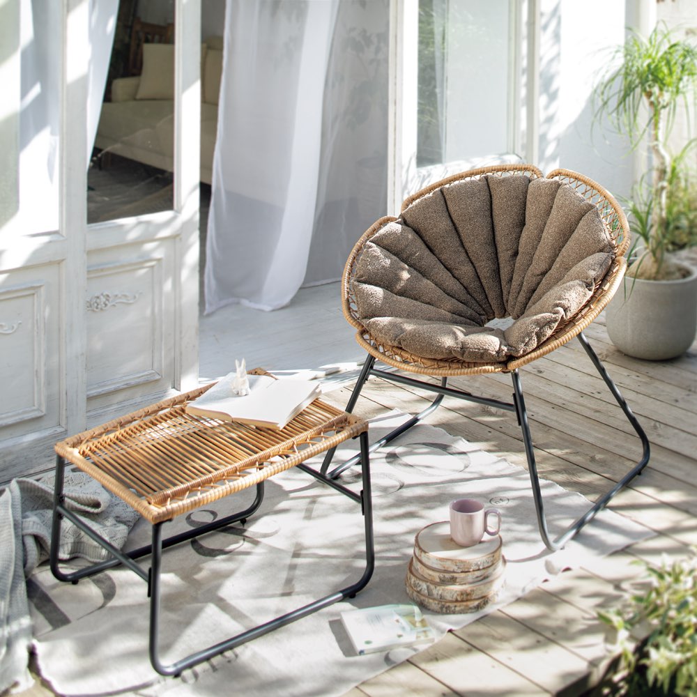 ひなげし=ポピーの花をデザインした愛らしいフォルムで、その名も「ポピーチェア」。オットマンとクッション付きでお届け。