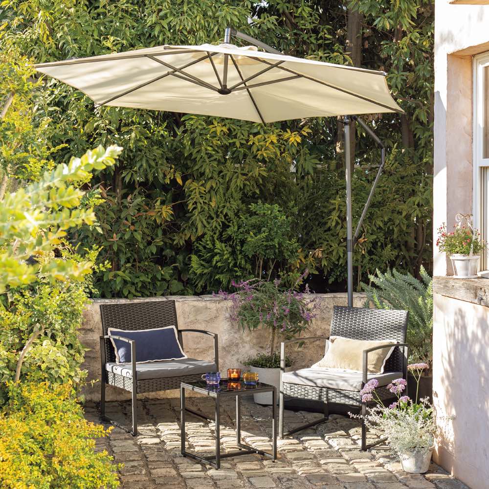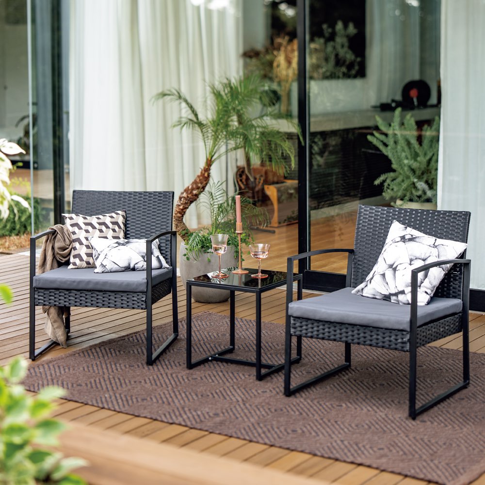 ラタン調の風合いが南国リゾートのガーデンカフェ気分を演出する、コストパフォーマンスの高い3点セットです。