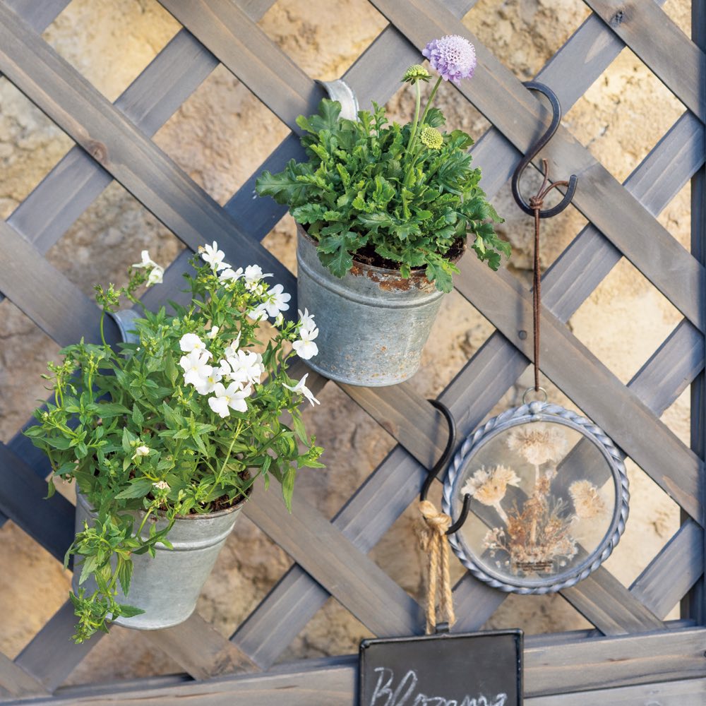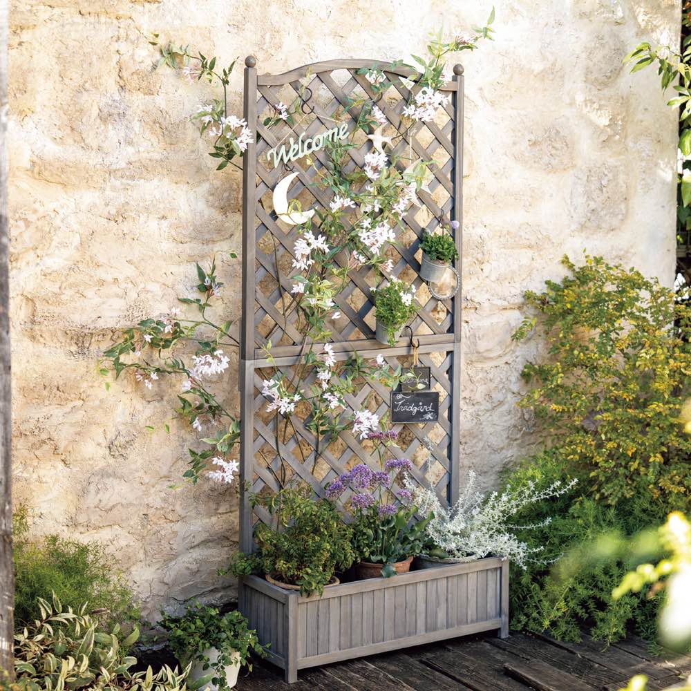 ラティスにツル性植物を誘引できてプランター付き、ハンギングもOK。英国風の装飾も格調高い、高コスパの木製フェンスです。