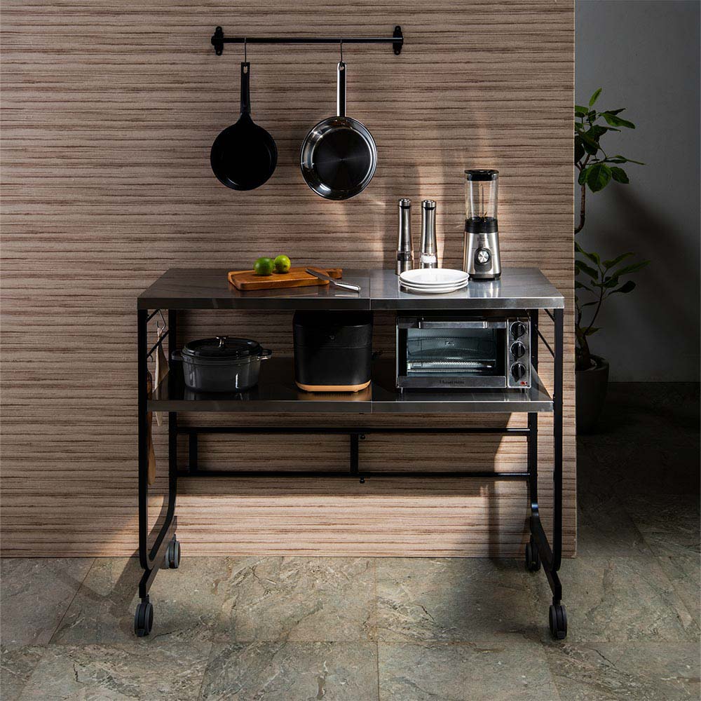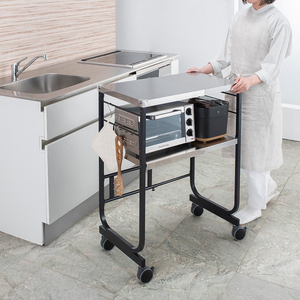 無段階で幅伸縮でき、キャスター付きで自由に動かせるステンレスカウンターは、幅40~65cm、55~90cm、70~120cmの3タイプ。調理スペースが少ないキッチンにゆとりが生まれ、まな板を2枚置いての料理やキッチン家電を置いた状態での調理、大皿料理の盛り付けもラクラクです。