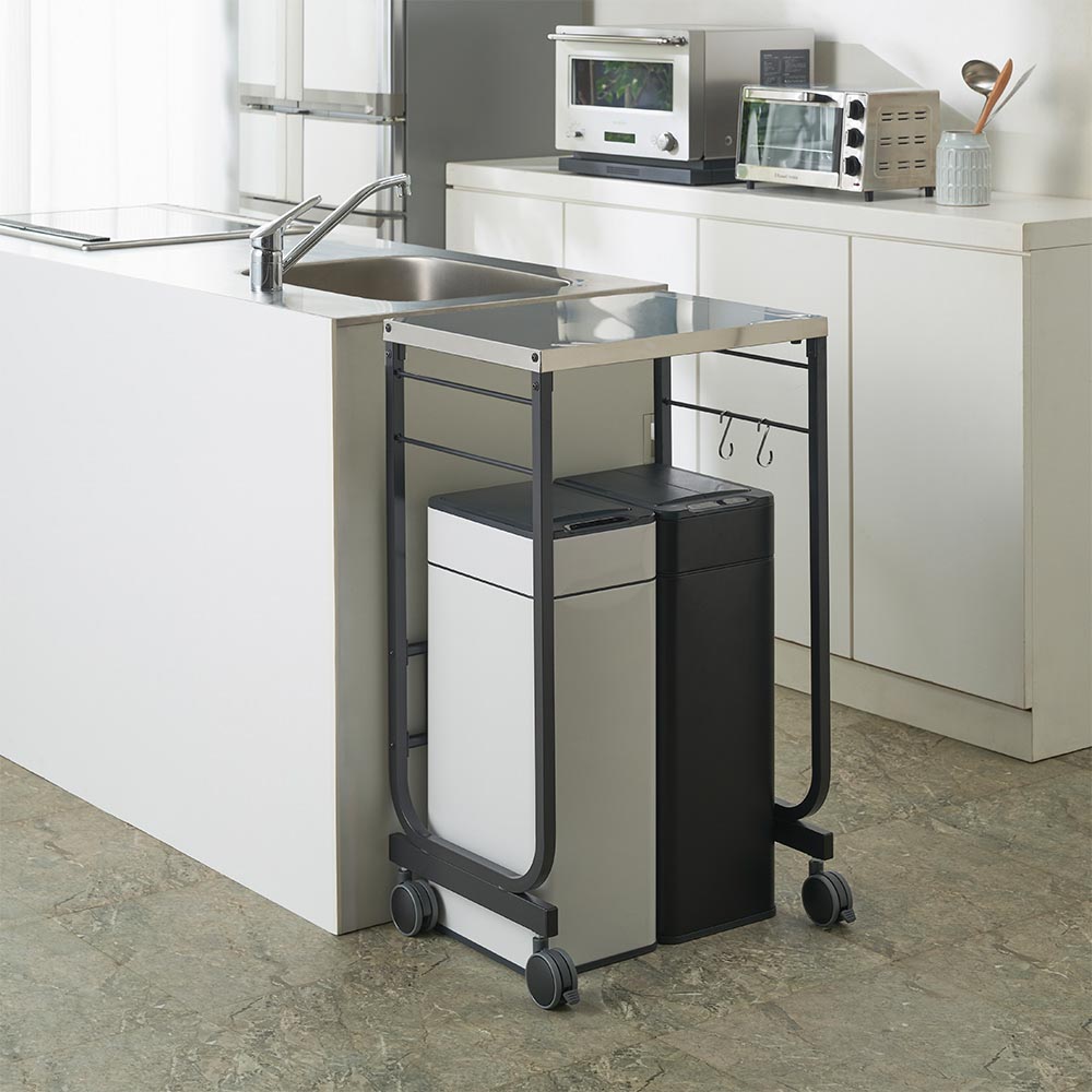 シンクサイドに置いても使いやすい高さ92cm。下にゴミ箱やストック類を置いたり、調理中のちょい置きスペースとして使ったり、一度使えば納得の便利さです。商品画像の説明。