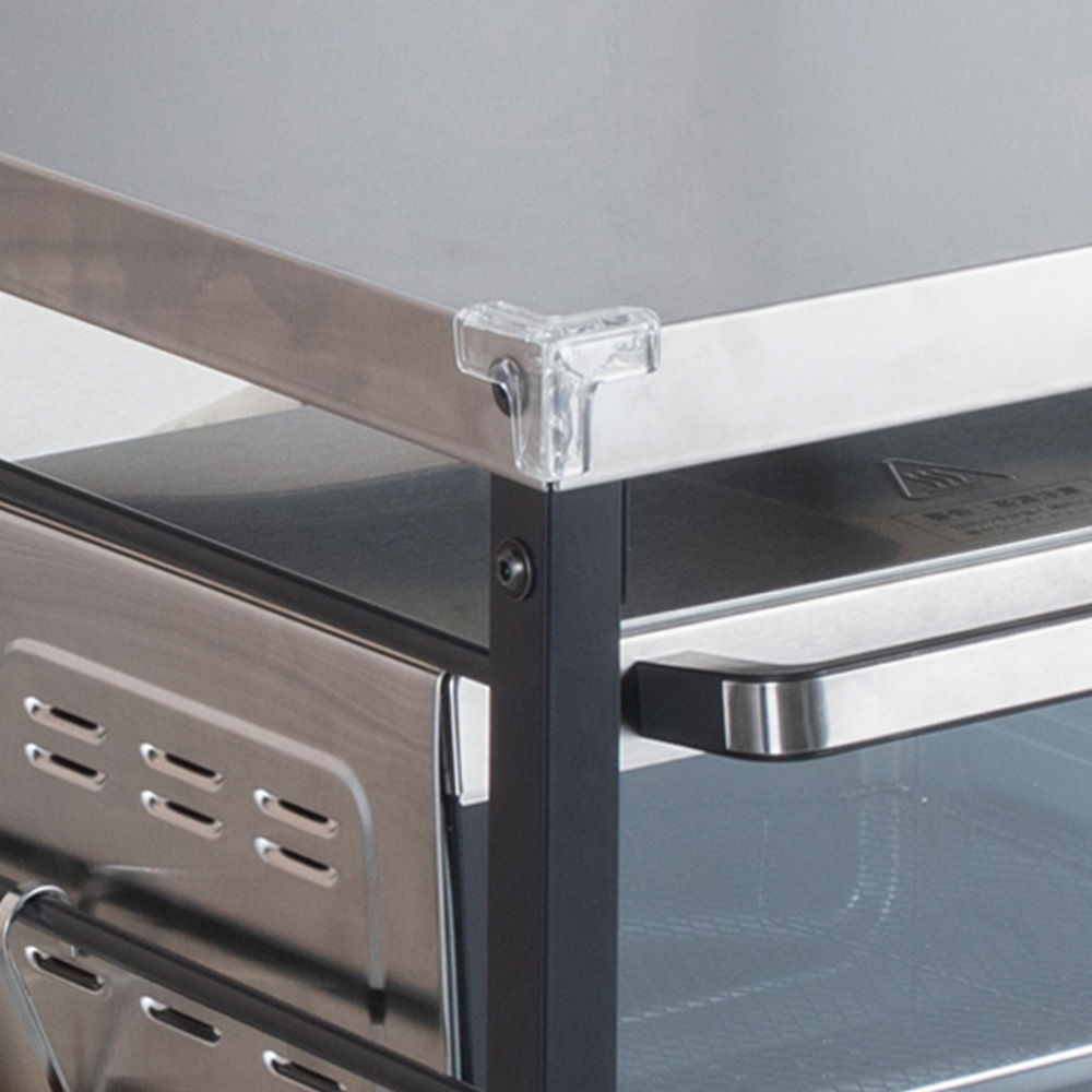 安全と使いやすさのための配慮が随所に高い技術力で隅々まで滑らかに仕上げ、コーナーには着脱可能な保護キャップを設置。サイドにS字フックが掛けられるバーを付けるなど、安全性と使いやすさのための配慮を随所に施しました。
