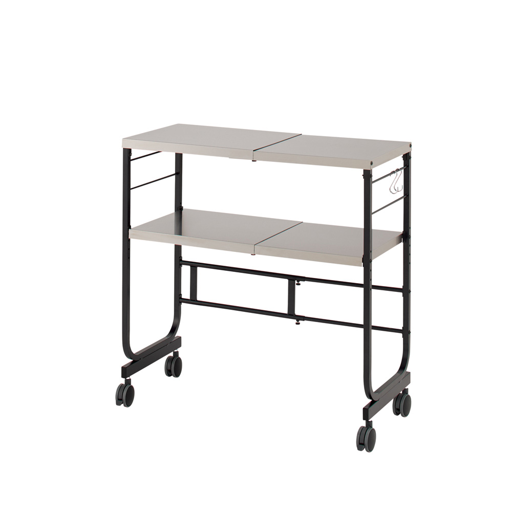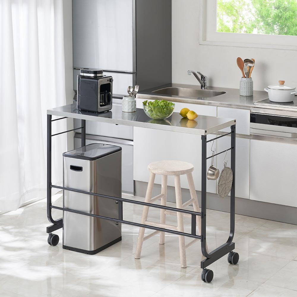 写真は幅40cm~幅65cmタイプスペースや使い方に合わせて無段階幅伸縮が可能無段階で幅伸縮でき、キャスター付きで自由に動かせるステンレスカウンターは、幅40~65cm、55~90cm、70~120cmの3タイプ。調理スペースが少ないキッチンにゆとりが生まれ、まな板を2枚置いての料理やキッチン家電を置いた状態での調理、大皿料理の盛り付けもラクラクです。